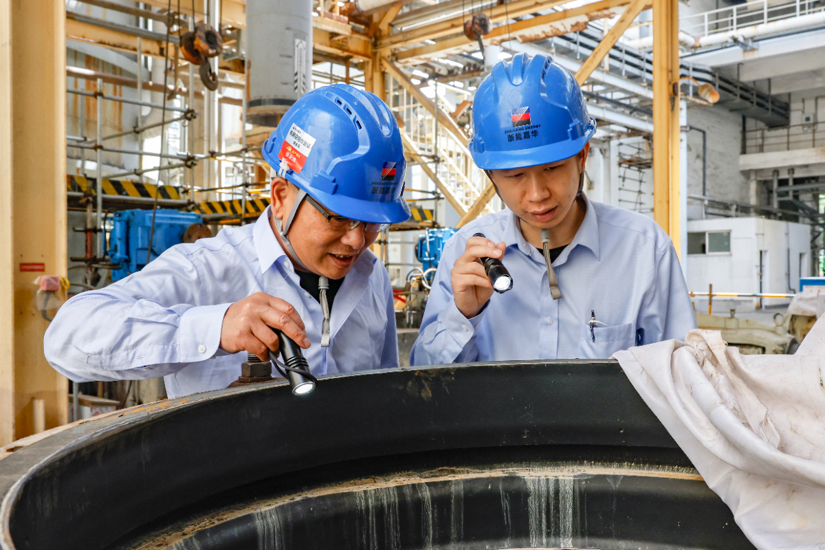 嘉電維護部鍋爐四班班長徐永忠與鍋爐專業(yè)組長沈忠明檢查零部件。 王侃 攝