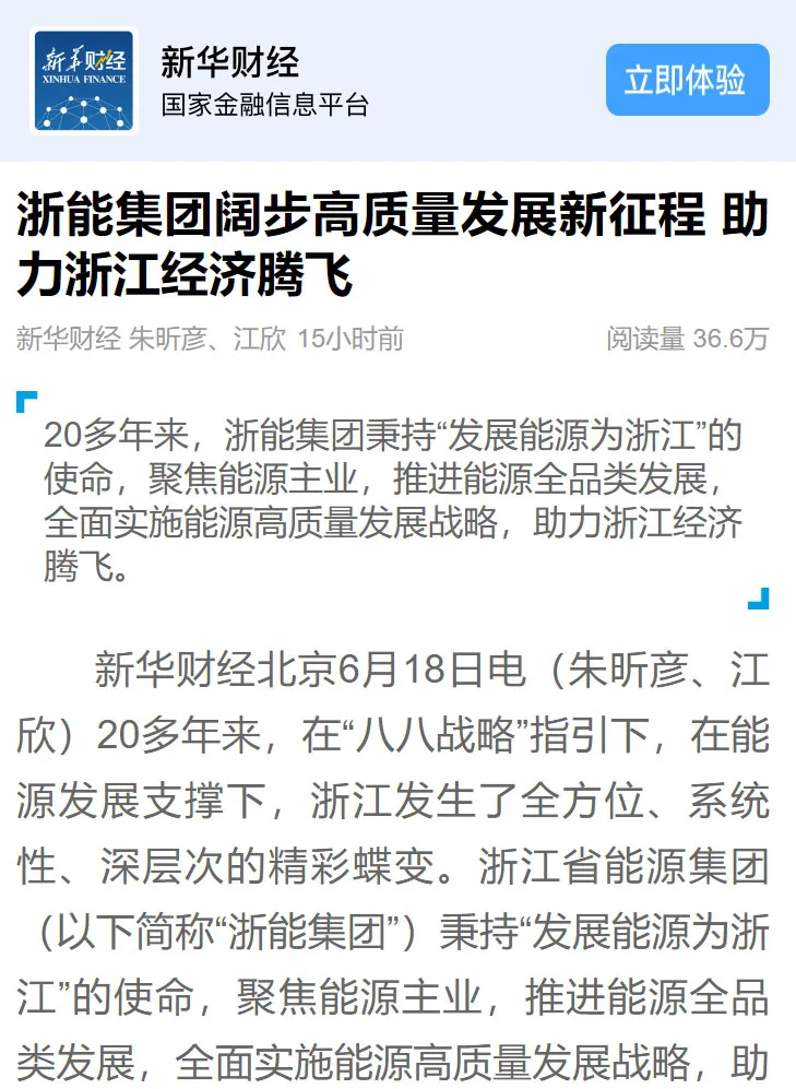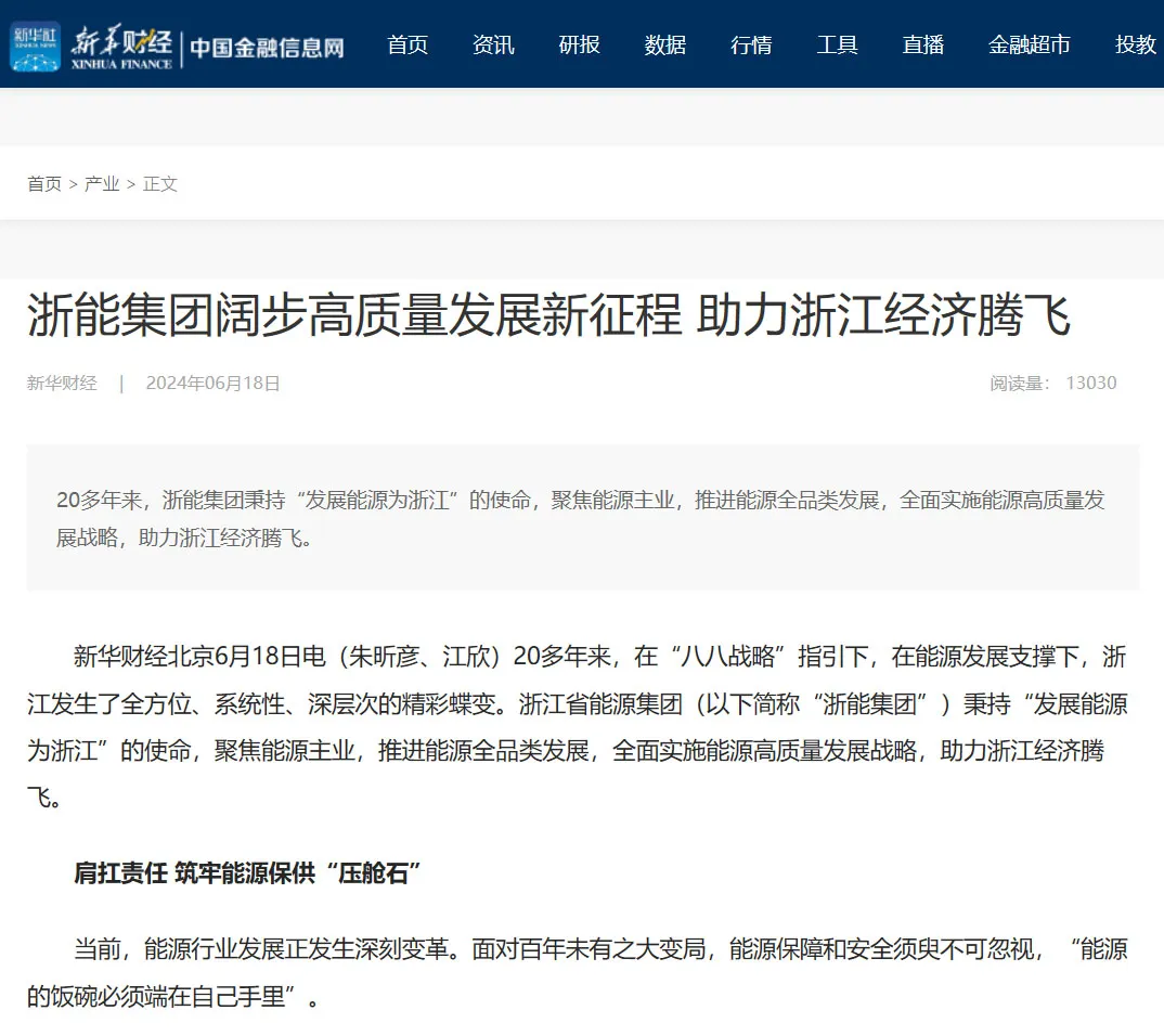 6月18日,新華社“新華財經”客戶端報道《浙能集團闊步高質量發(fā)展新征程 助力浙江經濟騰飛》。
