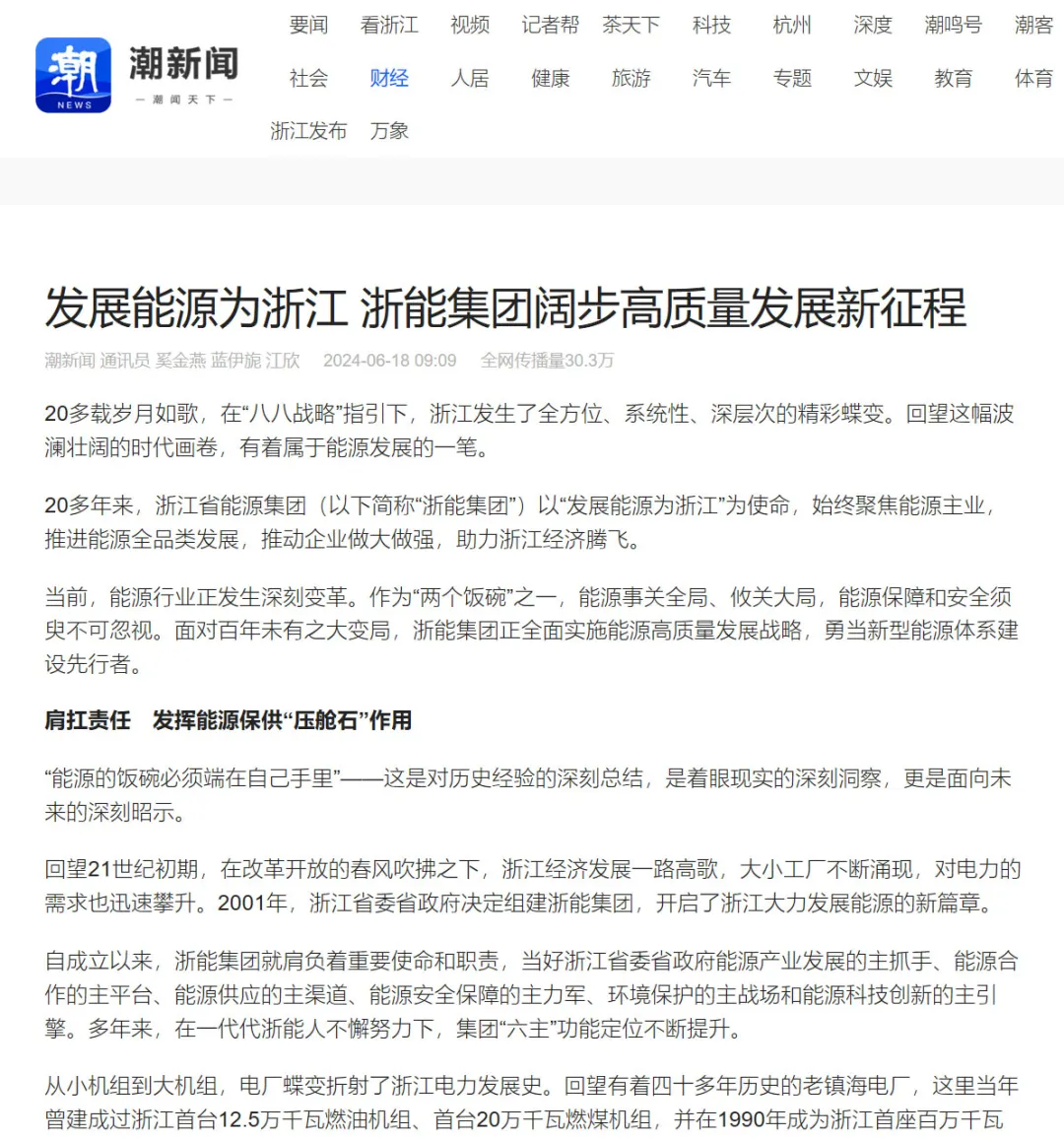 6月18日,“潮新聞”客戶端報道《發(fā)展能源為浙江 浙能集團闊步高質量發(fā)展新征程》。