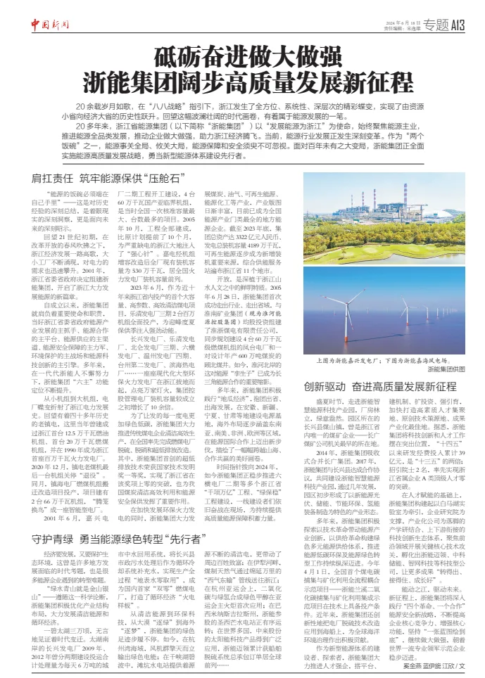 6月18日,中新社《中國新聞》報刊發(fā)《砥礪奮進做大做強 浙能集團闊步高質量發(fā)展新征程》。