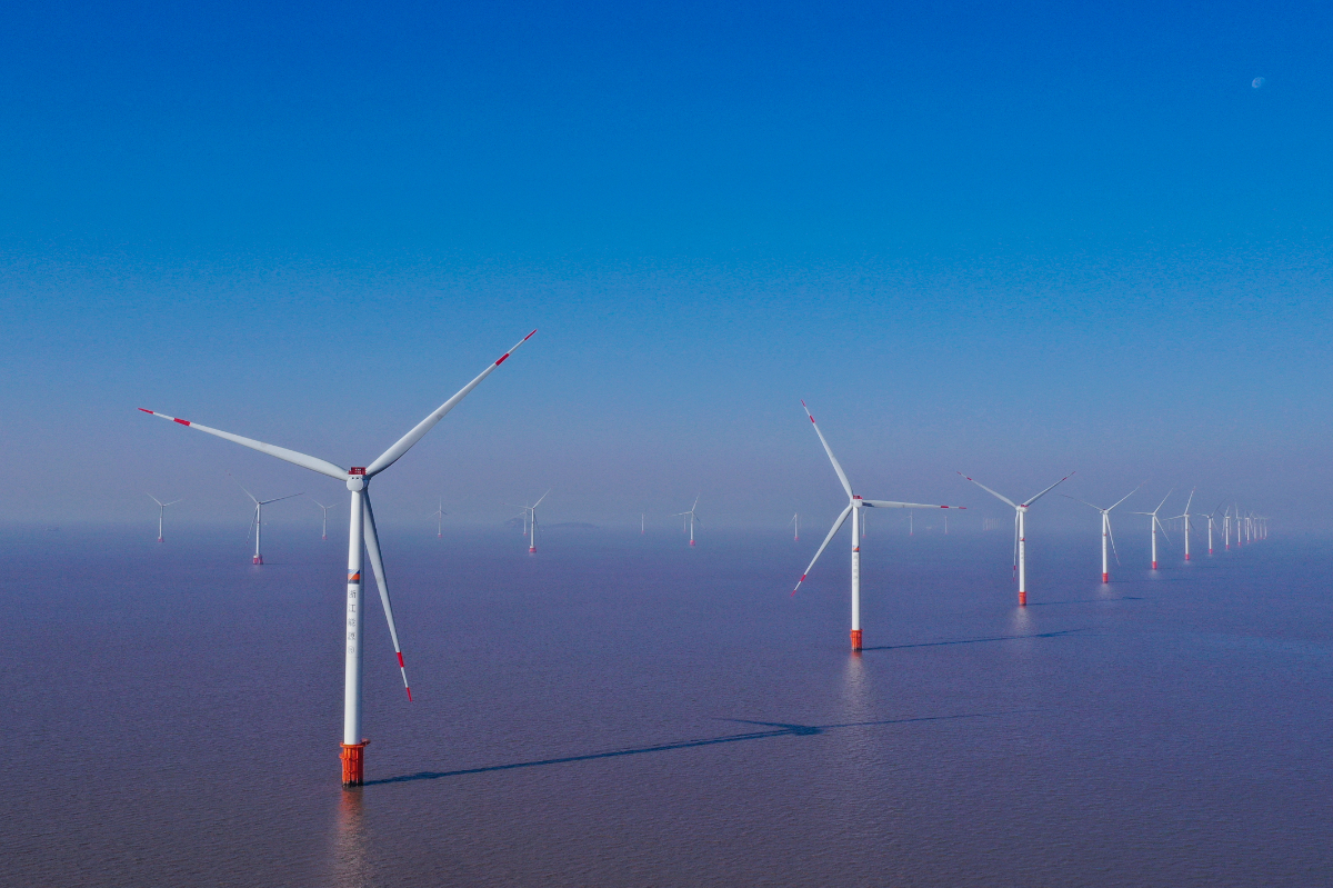 在杭州灣海域,風機群擎天而立輸出綠色電能,圖為浙能嘉海風電場。 張露 提供
