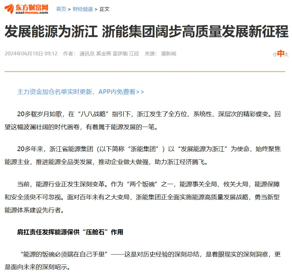 6月18日,東方財富網報道《發(fā)展能源為浙江 浙能集團闊步高質量發(fā)展新征程》。