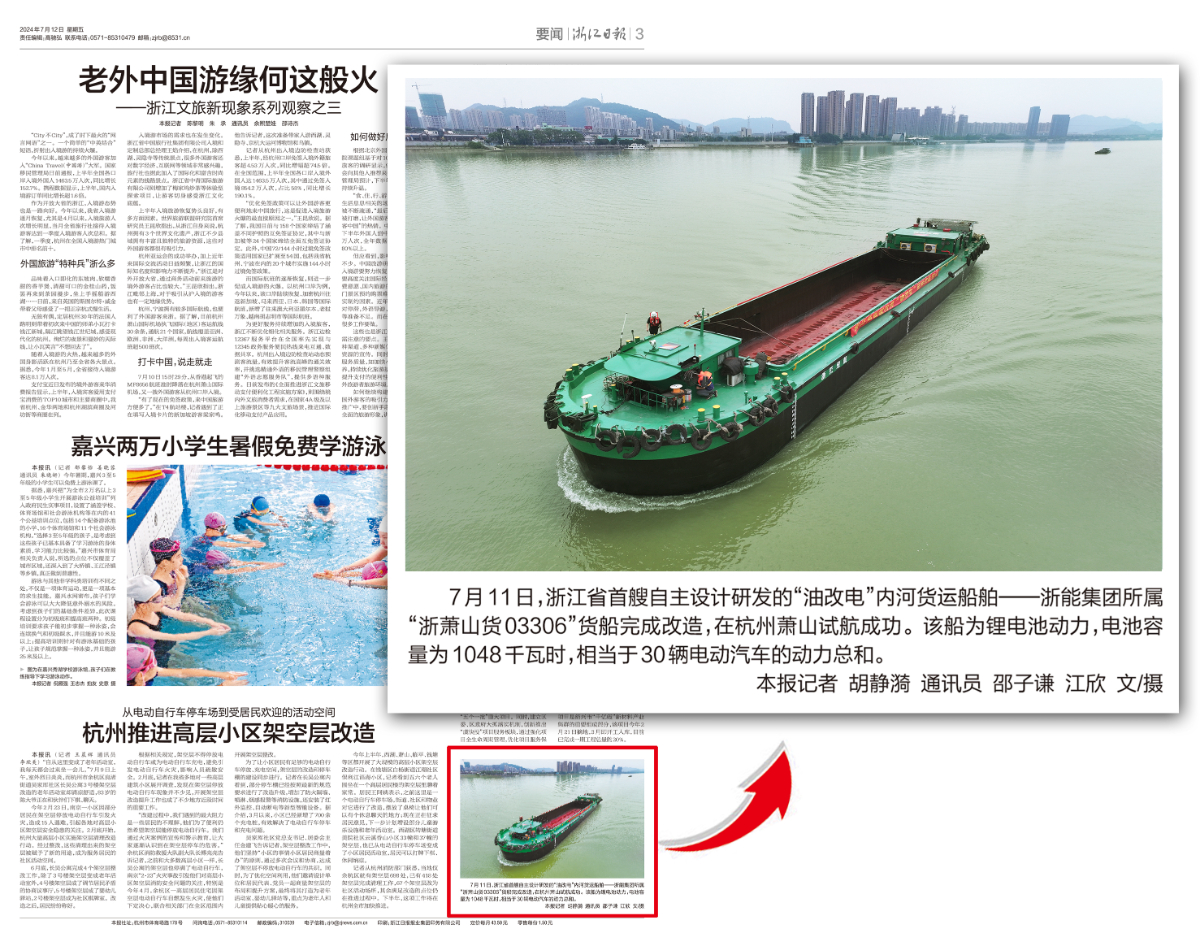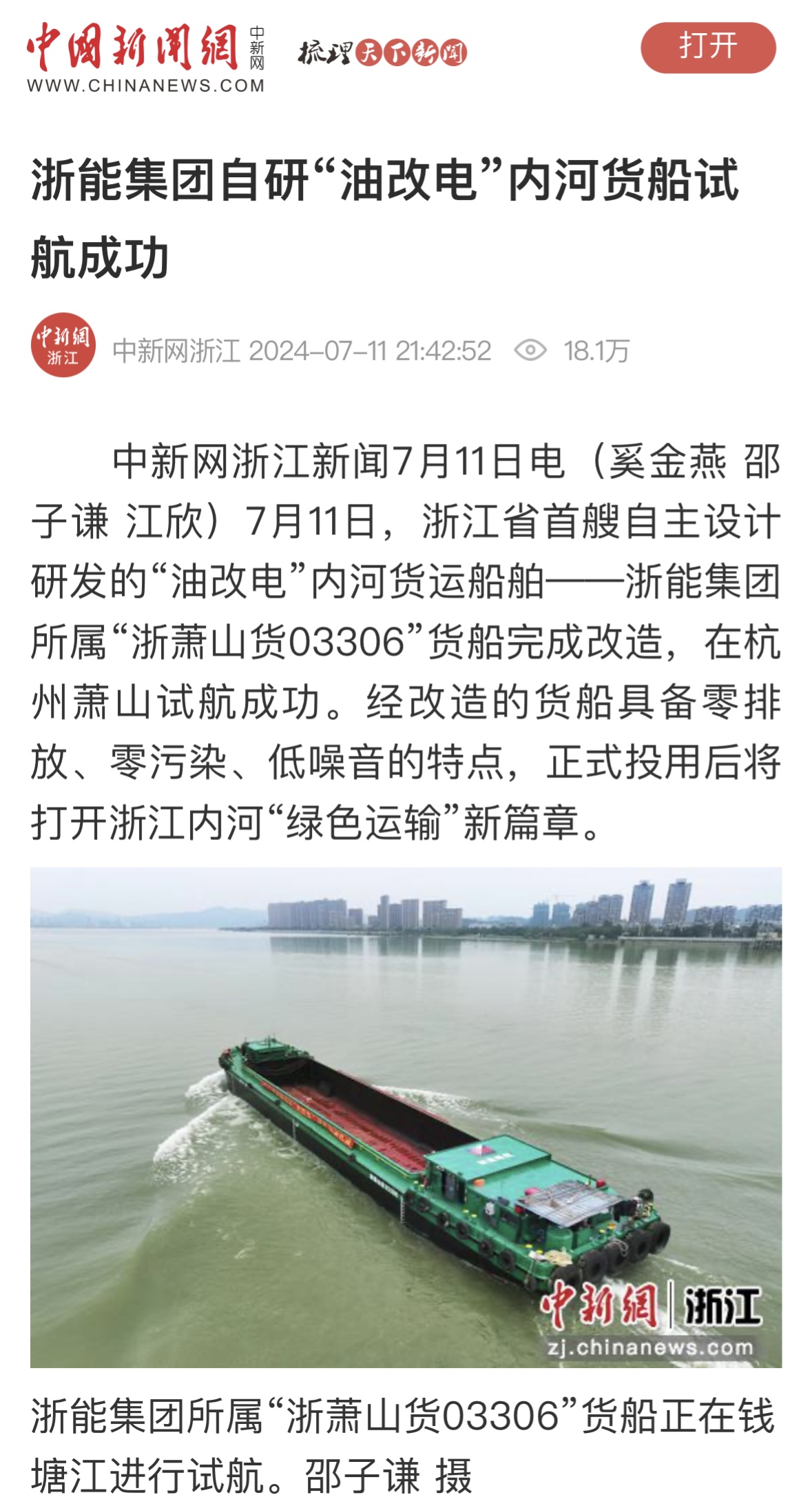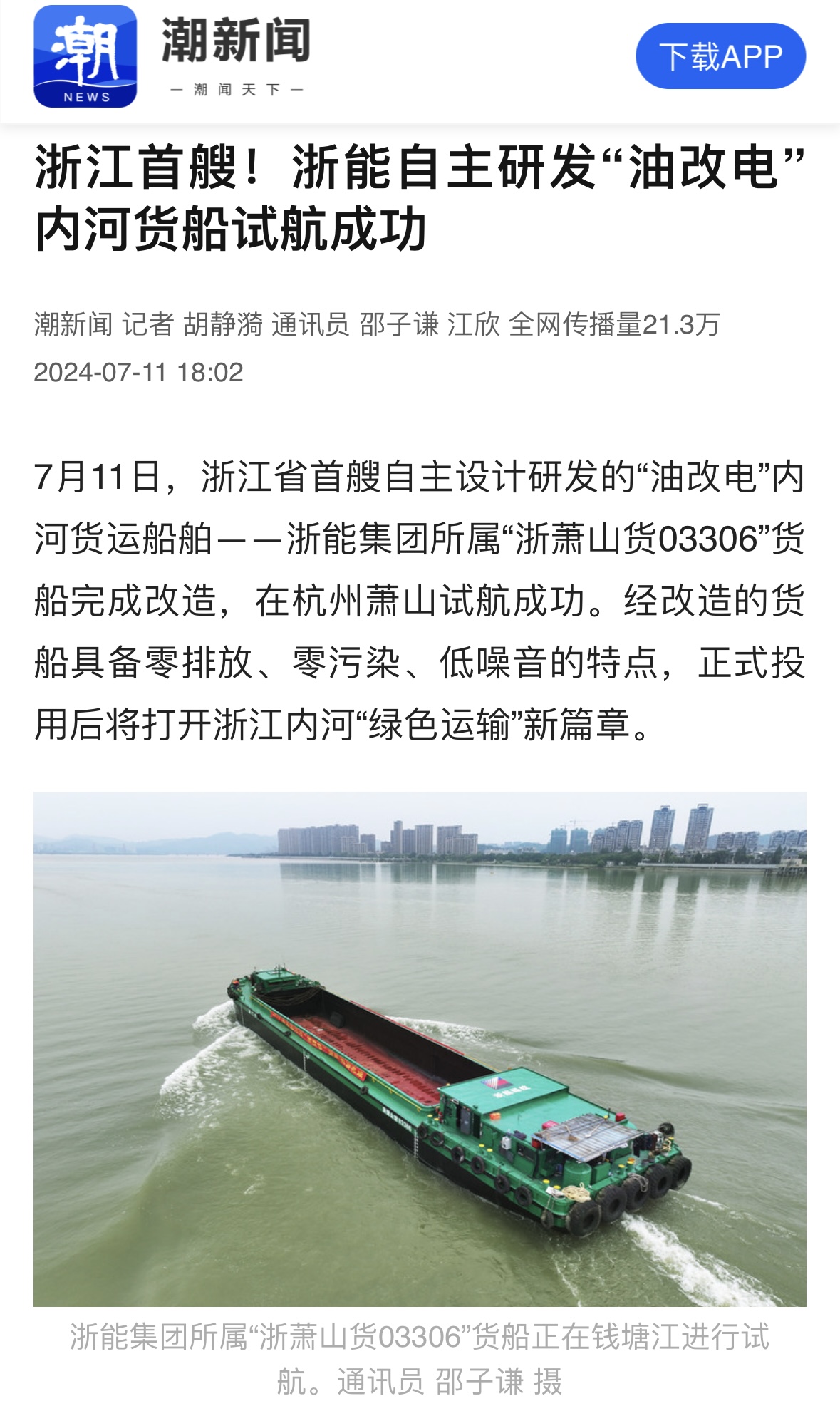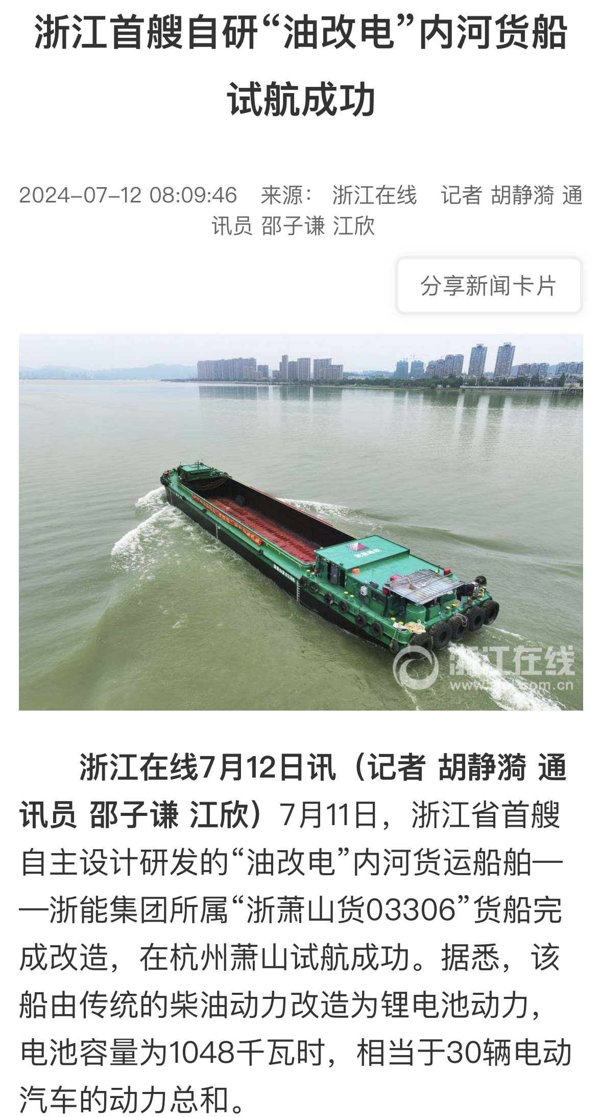 7月11日,中國新聞網(wǎng)報(bào)道《浙能集團(tuán)自研“油改電”內(nèi)河貨船試航成功》。 中國新聞網(wǎng) 圖