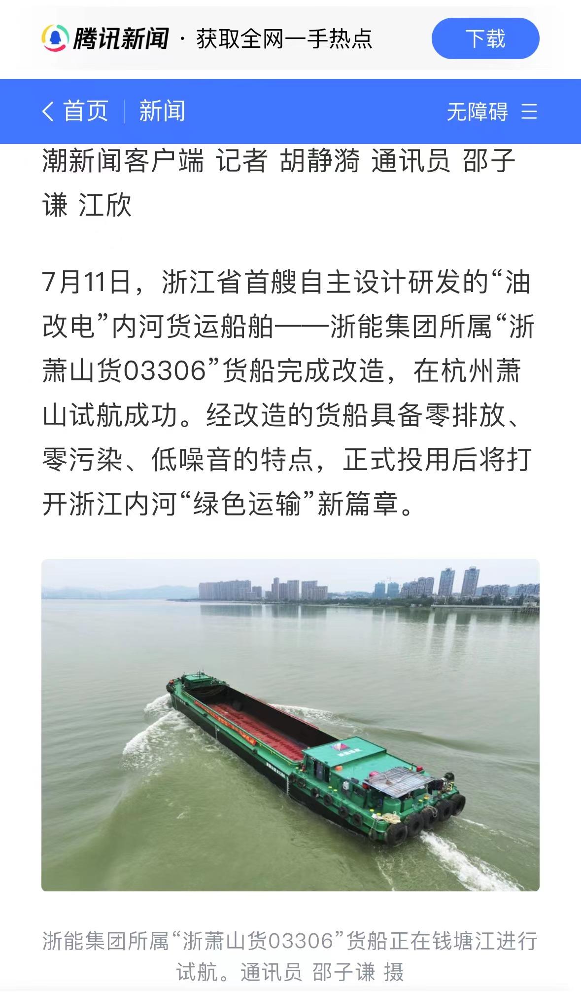7月11日,騰訊新聞報(bào)道《浙能集團(tuán)自研“油改電”內(nèi)河貨船試航成功》。 騰訊新聞 圖