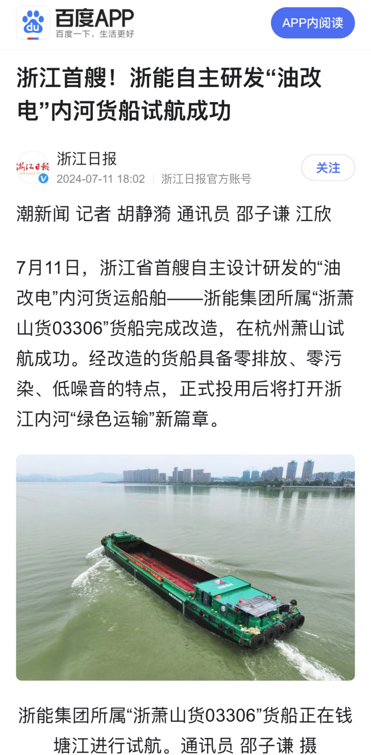 7月11日,百度報(bào)道《浙能集團(tuán)自研“油改電”內(nèi)河貨船試航成功》。 百度 圖