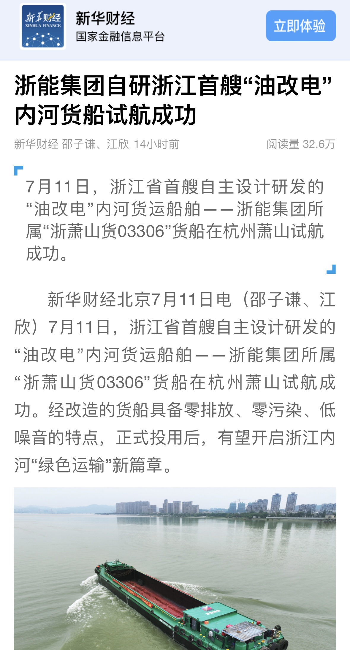 7月11日,新華財(cái)經(jīng)報(bào)道《浙能集團(tuán)自研“油改電”內(nèi)河貨船試航成功》。 新華財(cái)經(jīng) 圖