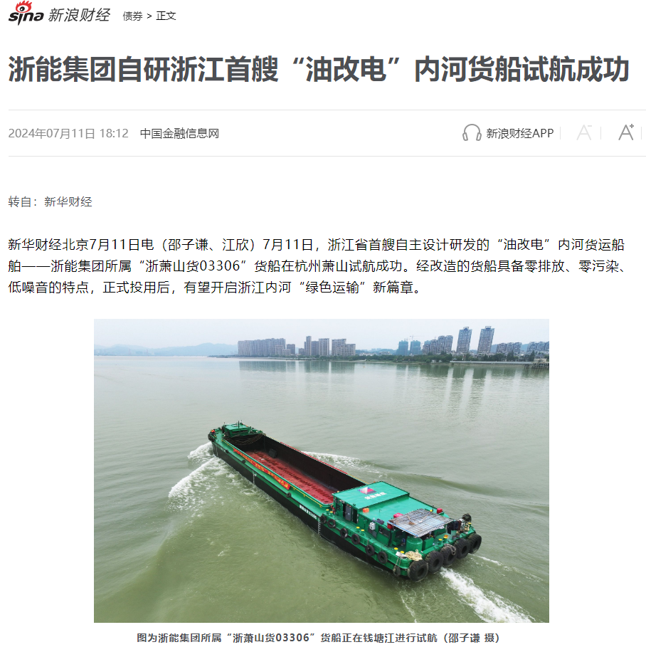 7月12日,新浪財(cái)經(jīng)轉(zhuǎn)載報(bào)道《浙能集團(tuán)自研“油改電”內(nèi)河貨船試航成功》。 新浪財(cái)經(jīng) 圖