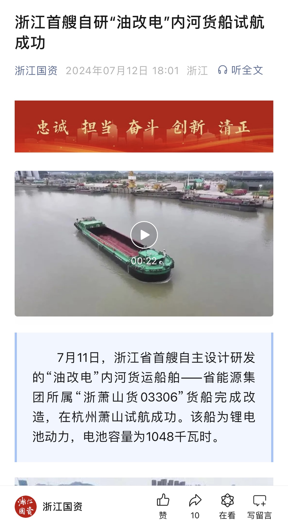 7月12日,浙江在線公眾號(hào)報(bào)道《浙能集團(tuán)自研“油改電”內(nèi)河貨船試航成功》。 浙江在線 圖
