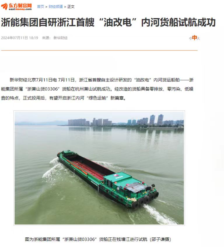 7月12日,東方財(cái)富網(wǎng)報(bào)道《浙能集團(tuán)自研“油改電”內(nèi)河貨船試航成功》。 東方財(cái)富網(wǎng) 圖