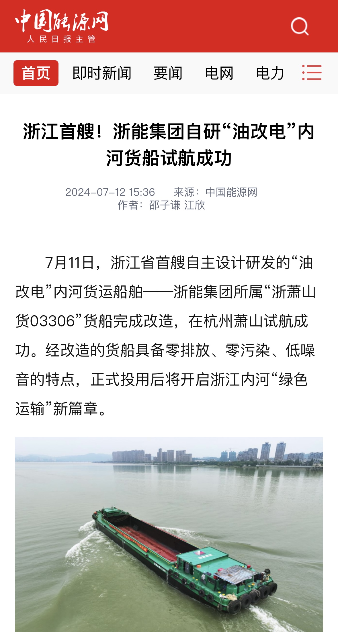 7月12日,中國能源網(wǎng)報(bào)道《浙能集團(tuán)自研“油改電”內(nèi)河貨船試航成功》。 中國能源網(wǎng) 圖