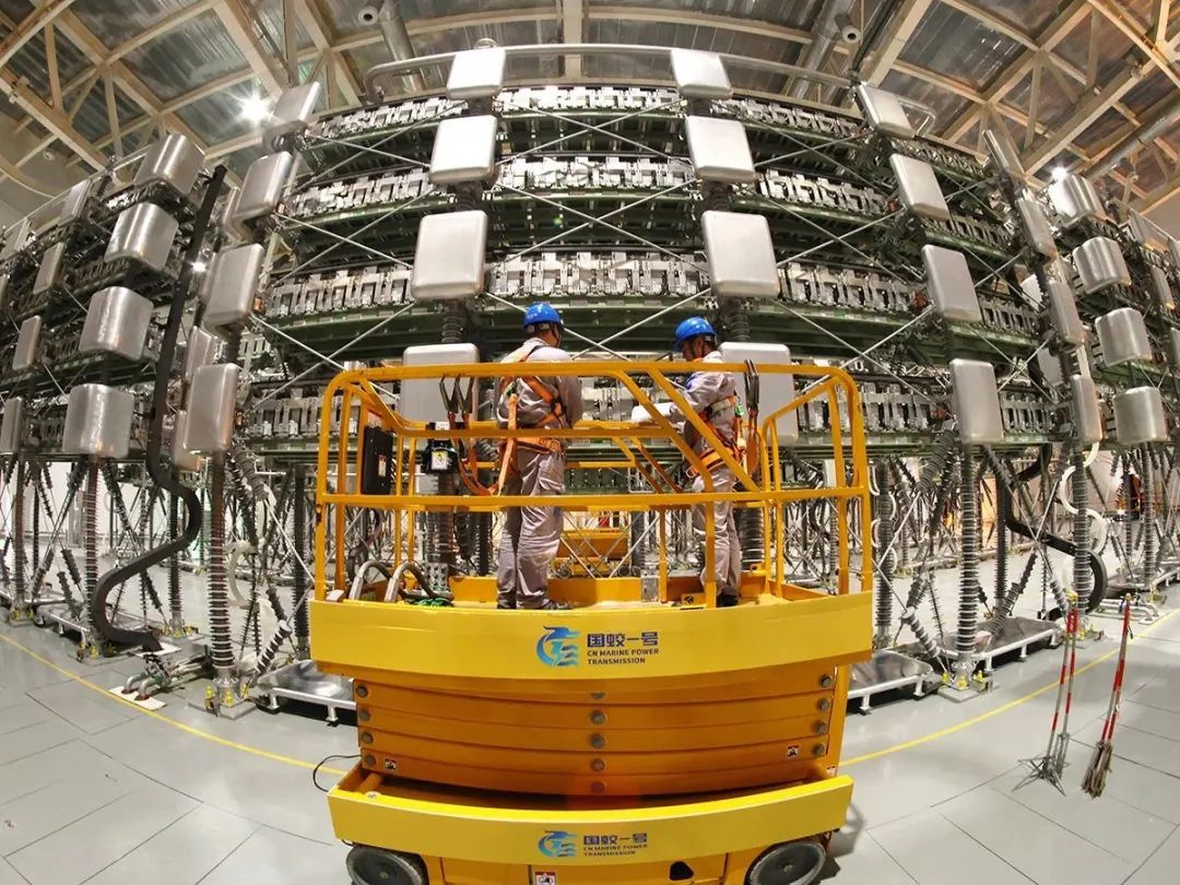 舟山五端柔性直流輸電工程,國網(wǎng)舟山供電公司電力工人進行柔直換流站閥廳子模塊調(diào)試。