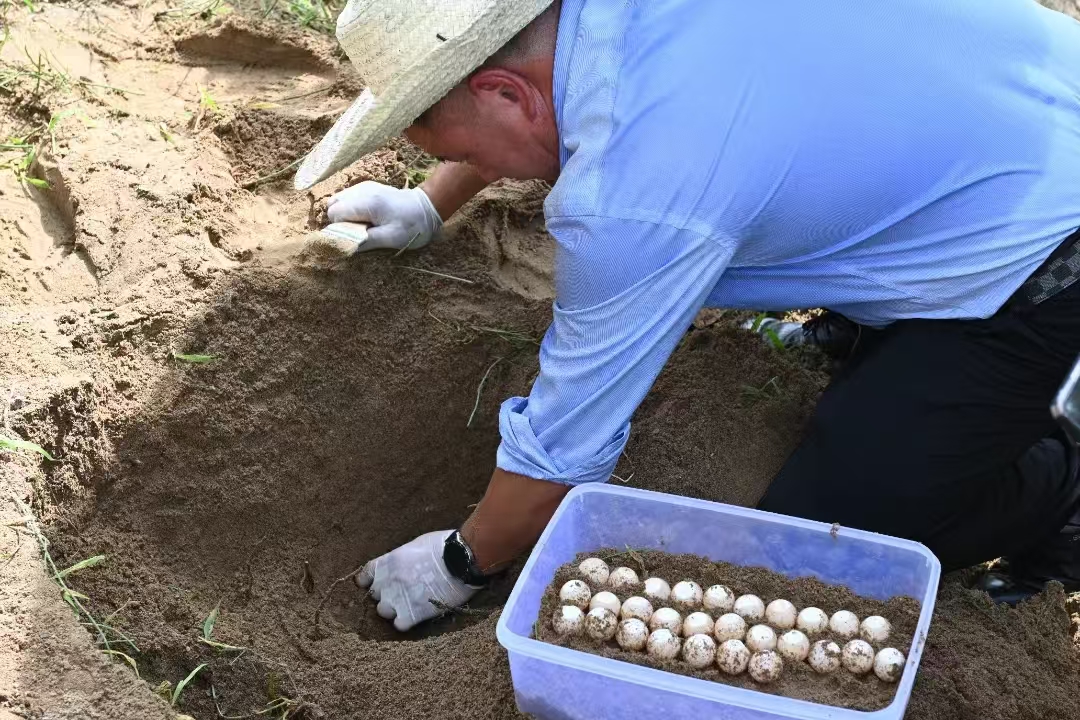 隨著表面黃褐色的沙土被撥開(kāi),在大約深30公分的位置,一枚枚雪白的黿卵也現(xiàn)出真容,葉承義用刷子輕輕掃開(kāi)黿卵旁邊的泥土,小心翼翼將它們拿進(jìn)塑料盒,帶回站內(nèi)的控溫車間內(nèi)進(jìn)行測(cè)量、登記,以便孵化。