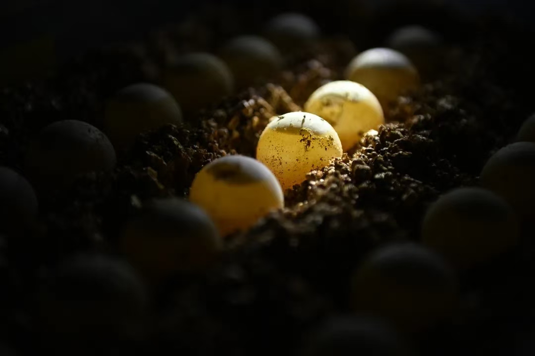 6月28日上午,在浙江青田浙能灘坑水電站水生生物增殖放流站,工作人員將母黿“貝貝”今年產(chǎn)的首批黿卵取回,共計(jì)48枚,其中有47枚受精,每枚平均重量約16克,直徑在3厘米左右。此次人工輔助繁育和保種工作,將有效提高黿卵孵化率,進(jìn)一步助推野生黿種群資源恢復(fù)。