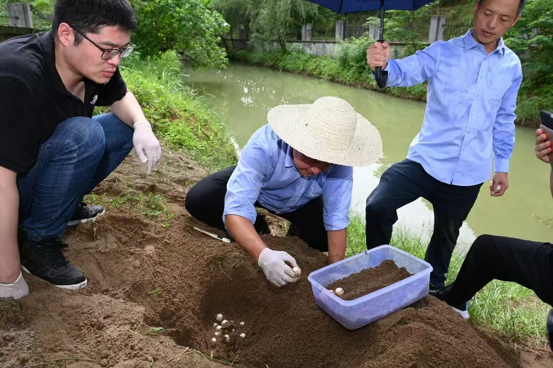 在灘坑水電站水生生物增殖放流站親黿培育池旁的土坡上,增殖放流站站長(zhǎng)葉承義正在珠江水產(chǎn)研究所所長(zhǎng)朱新平的遠(yuǎn)程指導(dǎo)下,對(duì)黿卵進(jìn)行操作。“我們不能亂挖一氣,濕潤(rùn)的沙土中往往埋藏著黿卵,挖的時(shí)候動(dòng)作必須要輕柔。”葉承義用手將產(chǎn)卵周邊的沙土一點(diǎn)點(diǎn)撥開(kāi)。