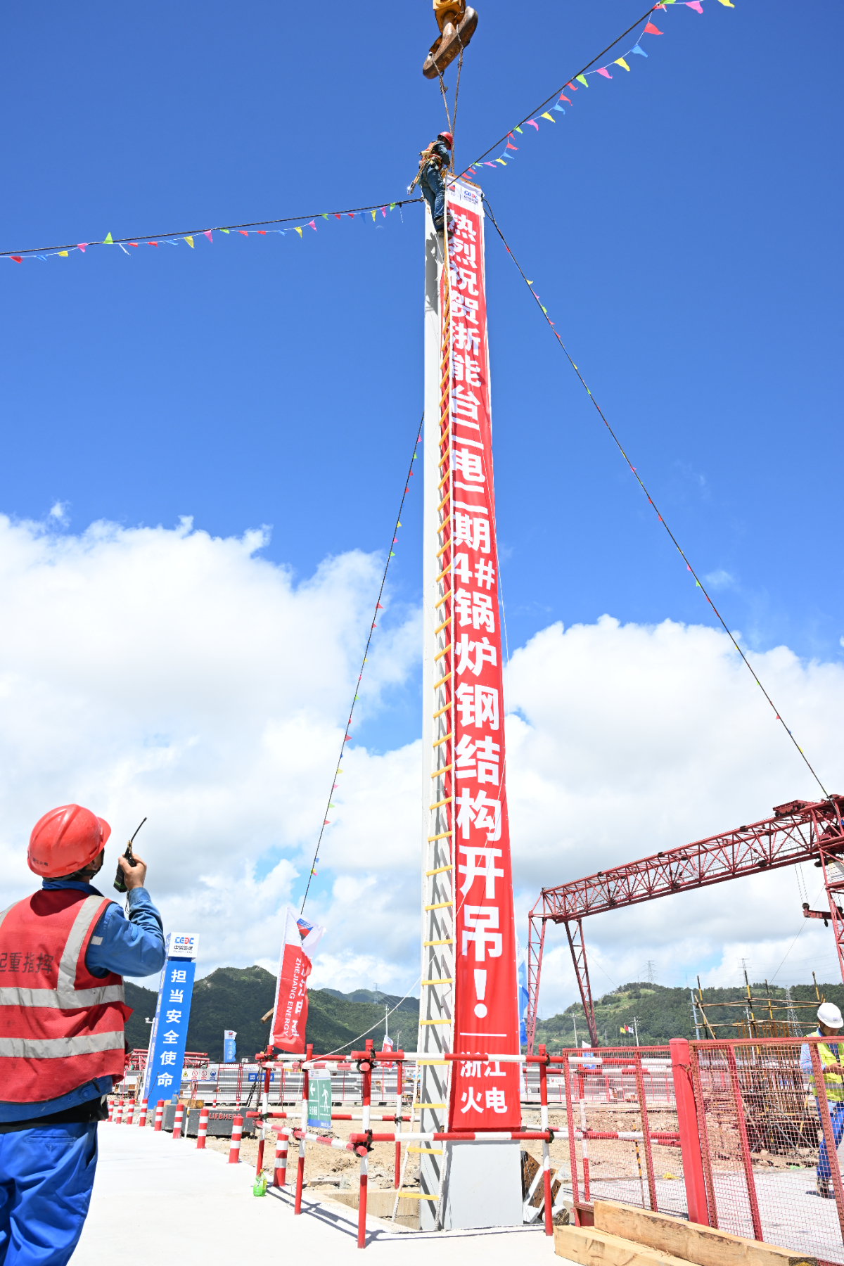 浙能臺二電二期4號鍋爐首根鋼結(jié)構(gòu)吊裝現(xiàn)場。 俞琬 提供