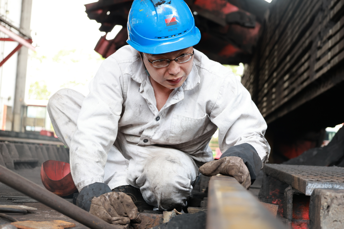 “撬棍再壓下來(lái)點(diǎn),再加一塊墊片試試。”在蘭溪發(fā)電公司翻車(chē)機(jī)房,陣陣熱浪撲面而來(lái),身著白色焊工服的褚建華剛到現(xiàn)場(chǎng)便急著俯身趴在翻車(chē)機(jī)活動(dòng)軌道上反復(fù)查看,不一會(huì)身上、帽子上便蹭上了許多煤粉,臉上的汗水“嗒嗒”地滴落在滾燙的鐵軌上迅速蒸發(fā),他的眼睛卻只是直直地盯著軌道,不停地對(duì)軌道高度做著調(diào)整,拆解螺栓、撬動(dòng)軌道、電焊加固……一套操作下來(lái),他已俯身在地一個(gè)多小時(shí)了,終于趕在煤車(chē)翻卸前完成了任務(wù)。他說(shuō),“熱點(diǎn)、累點(diǎn)都在其次,外面煤車(chē)這么多,我們可不能掉鏈子。在關(guān)鍵時(shí)期,設(shè)備安穩(wěn)了,我們心里才踏實(shí)。”