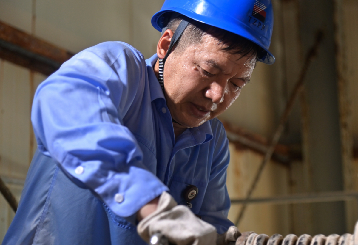 臺(tái)電維護(hù)部環(huán)保班班長(zhǎng)任呂華在悶熱潮濕環(huán)境中檢修石膏脫水設(shè)備。 崔雪 攝