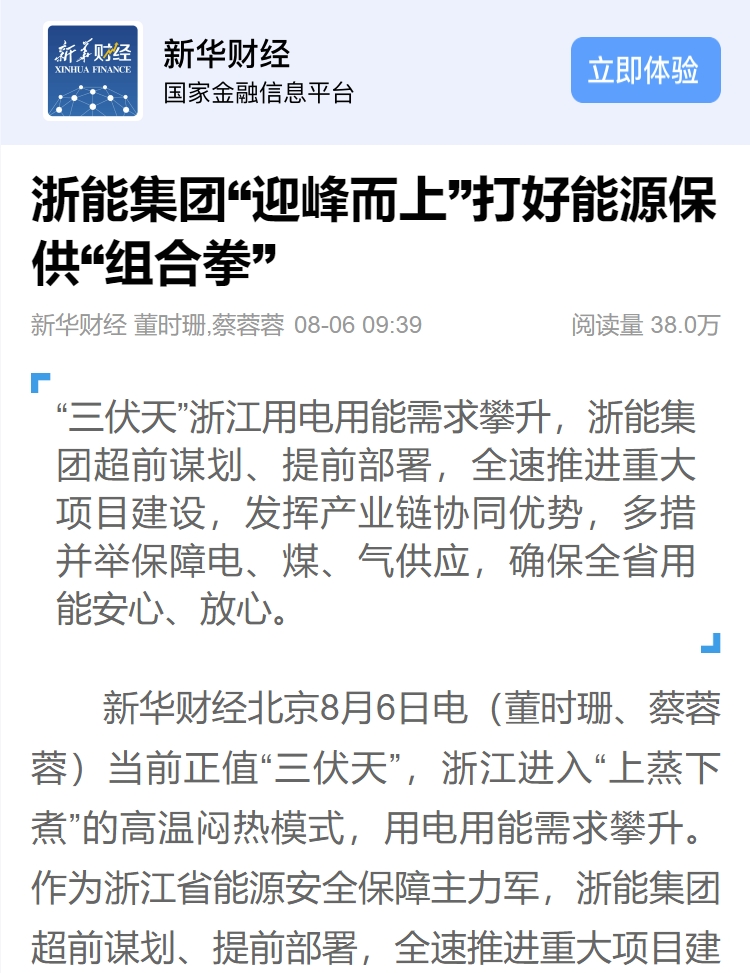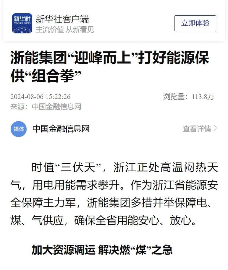 日前,新華社刊登報(bào)道《打好迎峰度夏“組合拳” 浙能集團(tuán)持續(xù)提升能源保供能力》,截至目前文章點(diǎn)擊量破百萬。