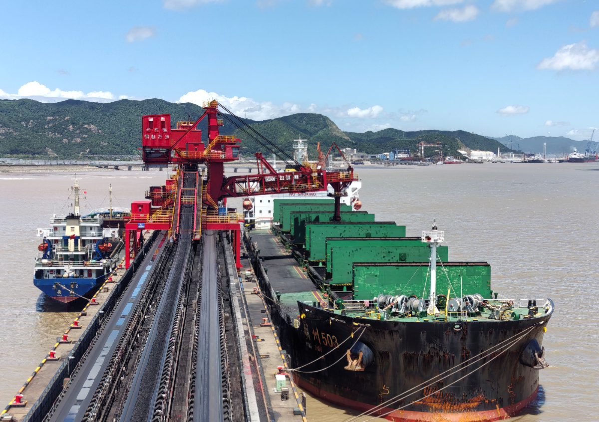 浙能集團(tuán)采購的進(jìn)口煤正在舟山六橫港搶裝,為省內(nèi)電廠送去夏日“口糧”。 劉洋 攝