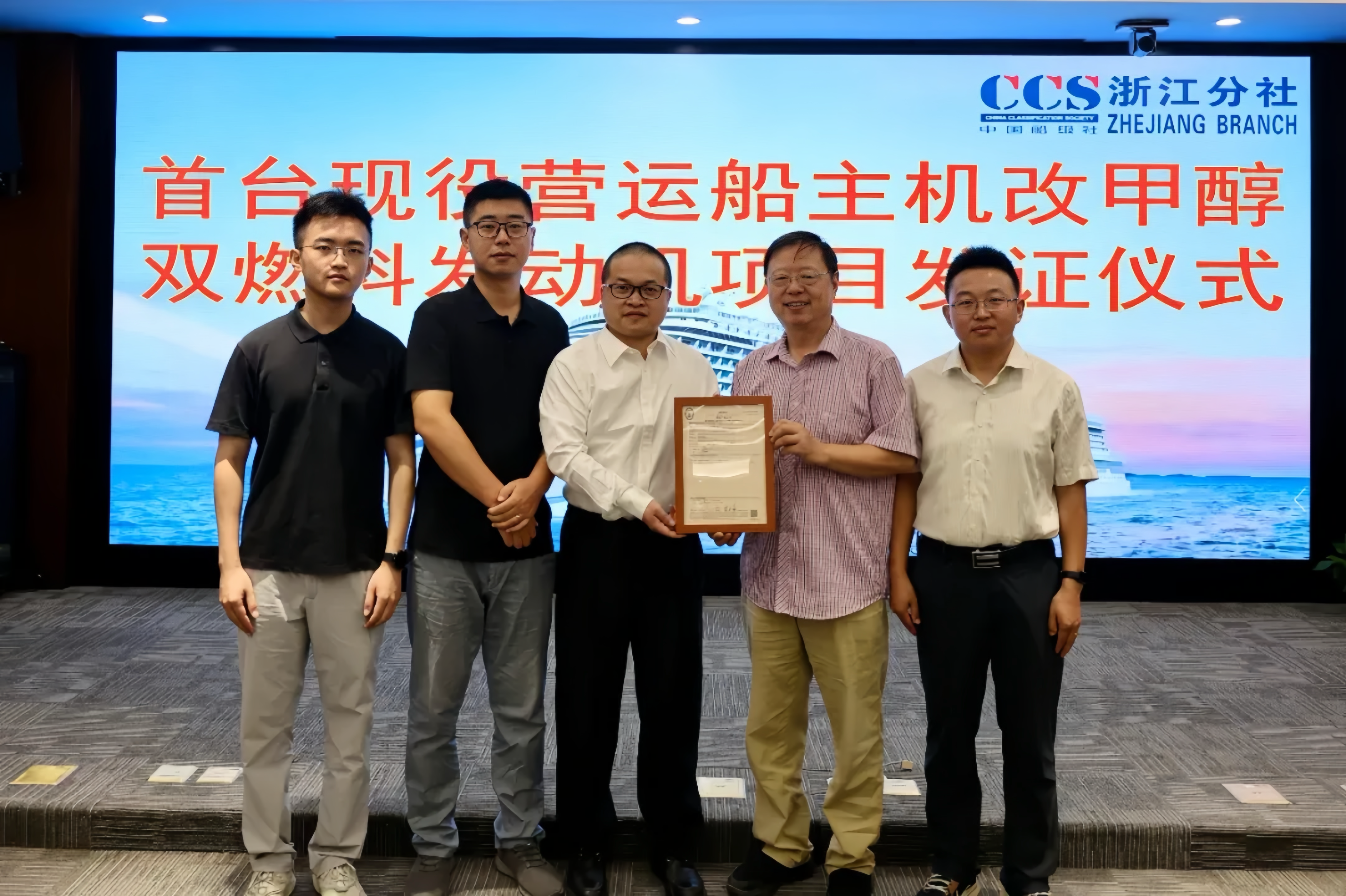 浙能邁領(lǐng)“領(lǐng)先1”輪主機(jī)獲頒首臺(tái)現(xiàn)役營運(yùn)船主機(jī)改裝為甲醇雙燃料發(fā)動(dòng)機(jī)項(xiàng)目證書。 中國船級(jí)社浙江分社 提供