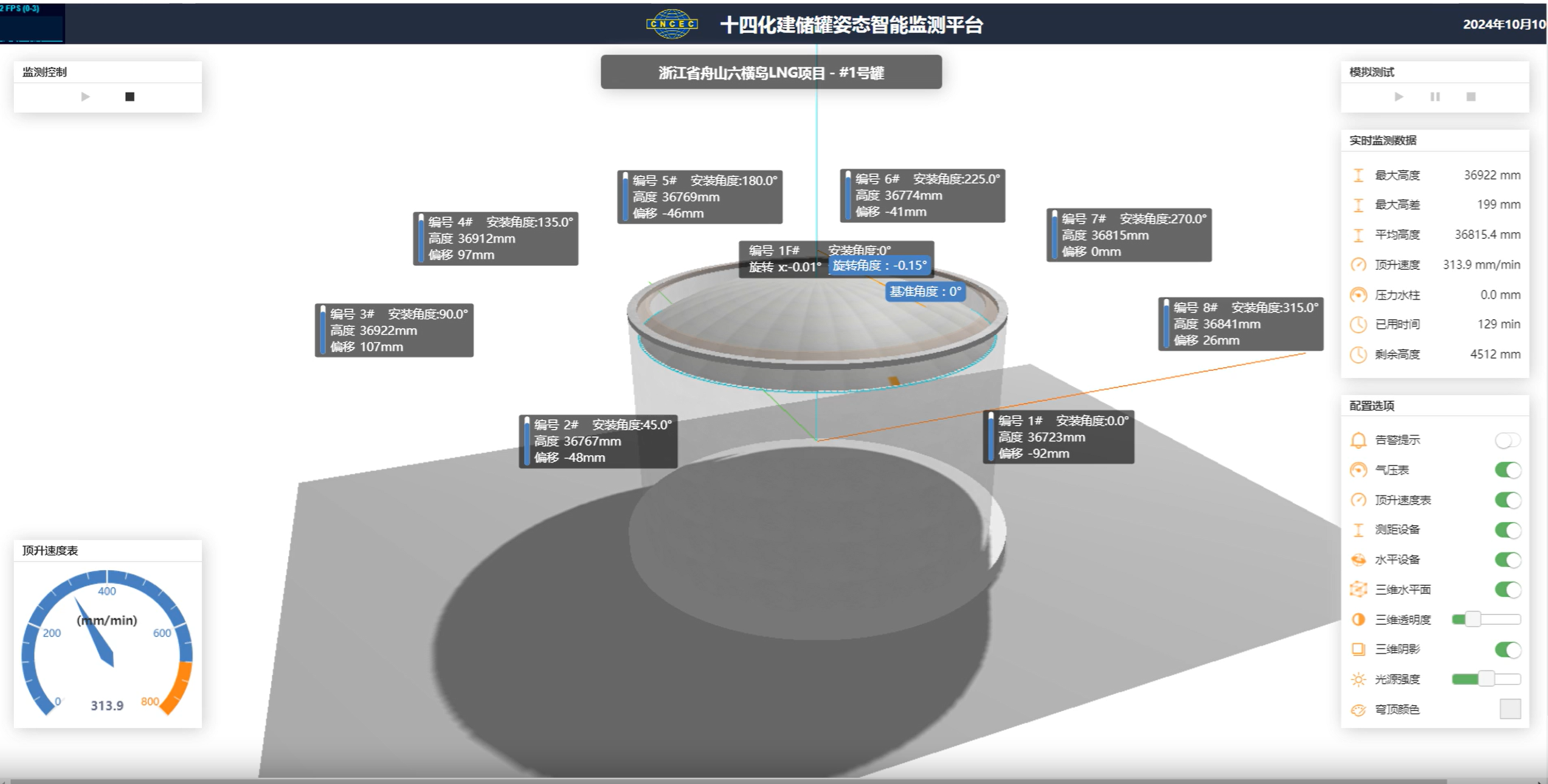 為確保“鋼帽”升起均衡平穩(wěn),浙能舟山六橫LNG接收站使用了“硬核科技”——數(shù)智化頂升系統(tǒng)。該系統(tǒng)主要依托遍布罐體的“神經(jīng)”——傳感器,實(shí)時(shí)收集風(fēng)壓、平衡鋼絲繩的拉力值以及頂升方位和速度等信息,并通過三維可視化智控軟件,實(shí)現(xiàn)風(fēng)壓智能控制、拱頂智能配重、頂升方位智能糾偏等功能,大幅減少了人工操作可能帶來的誤差,讓整個(gè)氣頂升過程精準(zhǔn)、智能、安全。