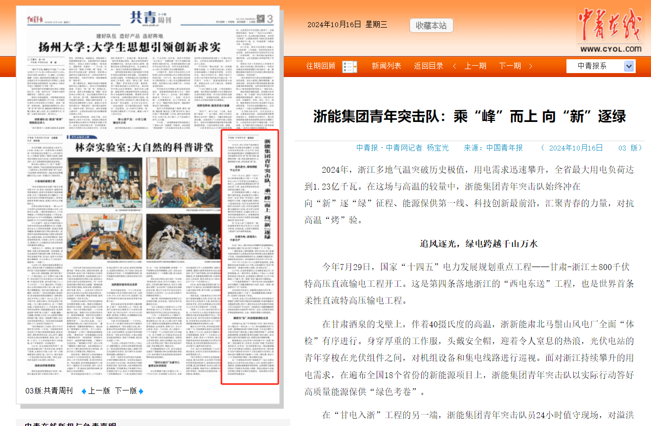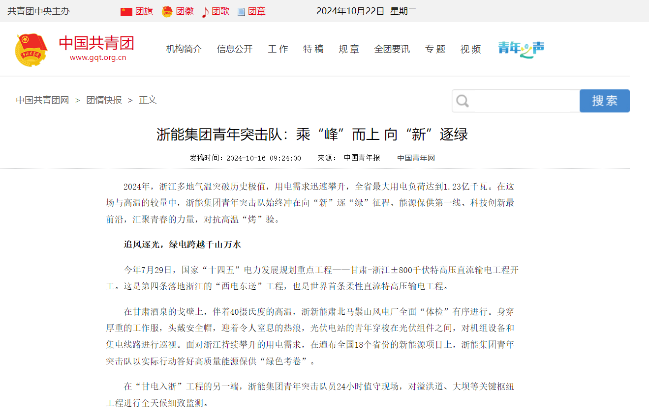編者按:浙能集團(tuán)青年突擊隊(duì)在2024年浙江多地氣溫突破歷史極值、用電需求迅速攀升的情況下,始終沖在向“新”逐“綠”征程、能源保供第一線(xiàn)、科技創(chuàng)新最前沿,匯聚青春的力量,對(duì)抗高溫“烤”驗(yàn)”。10月16日,中國(guó)青年報(bào)、共青團(tuán)中央官網(wǎng)等平臺(tái)刊發(fā)《浙能集團(tuán)青年突擊隊(duì):乘“峰”而上 向“新”逐綠》,聚焦浙能青春力量。