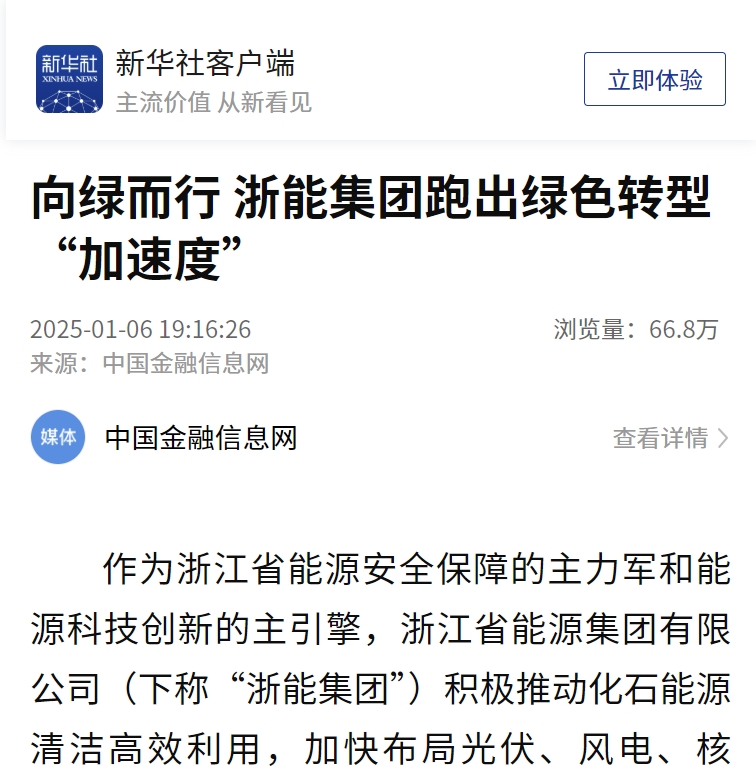近日,新華社推出浙能集團(tuán)高質(zhì)量發(fā)展主題系列報(bào)道,并于1月6日刊發(fā)《向綠而行 浙能集團(tuán)跑出綠色轉(zhuǎn)型“加速度”》。