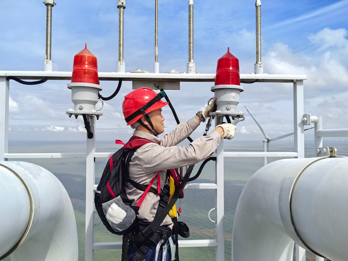 浙能嘉興海上風(fēng)電場(chǎng)維護(hù)人員正在檢修風(fēng)機(jī)航標(biāo)燈。 金山 提供