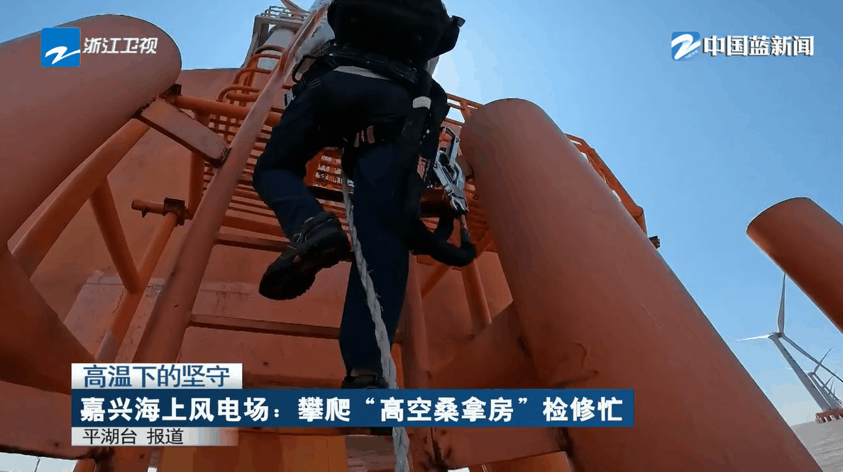 浙江衛(wèi)視《浙江新聞聯(lián)播》報(bào)道浙能嘉興1號(hào)海上風(fēng)場(chǎng)攀爬“高空桑拿房”檢修忙。 周晨 提供