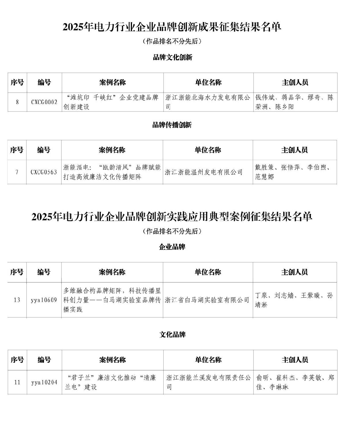 為深入貫徹《質(zhì)量強(qiáng)國建設(shè)綱要》,加快構(gòu)建新型電力系統(tǒng)背景下的品牌創(chuàng)新生態(tài)體系,切實(shí)推進(jìn)電力行業(yè)品牌建設(shè),發(fā)揮品牌引領(lǐng)示范作用,選樹一批電力品牌創(chuàng)新典型,中電聯(lián)電力品牌集群辦公室在行業(yè)內(nèi)開展了2025年電力行業(yè)企業(yè)品牌創(chuàng)新成果及實(shí)踐應(yīng)用典型案例征集活動(dòng),得到了廣大成員單位及有關(guān)單位的大力支持和積極參與。經(jīng)專家組嚴(yán)格遴選,本次活動(dòng)精選出了90項(xiàng)創(chuàng)新成果及79個(gè)典型案例。浙能北海水電《“灘坑印 千峽紅”企業(yè)黨建品牌創(chuàng)新建設(shè)》、浙能溫電《“甌韻清風(fēng)”品牌賦能打造高效廉潔文化傳播矩陣》獲評(píng)2025年電力行業(yè)企業(yè)品牌創(chuàng)新成果,白馬湖實(shí)驗(yàn)室《多維融合構(gòu)品牌矩陣,科技傳播顯科創(chuàng)力量一一白馬湖實(shí)驗(yàn)室品牌傳播實(shí)踐》、浙能蘭溪發(fā)電《“君子蘭”廉潔文化推動(dòng)“清廉蘭電”建設(shè)》獲評(píng)品牌創(chuàng)新實(shí)踐應(yīng)用典型案例。