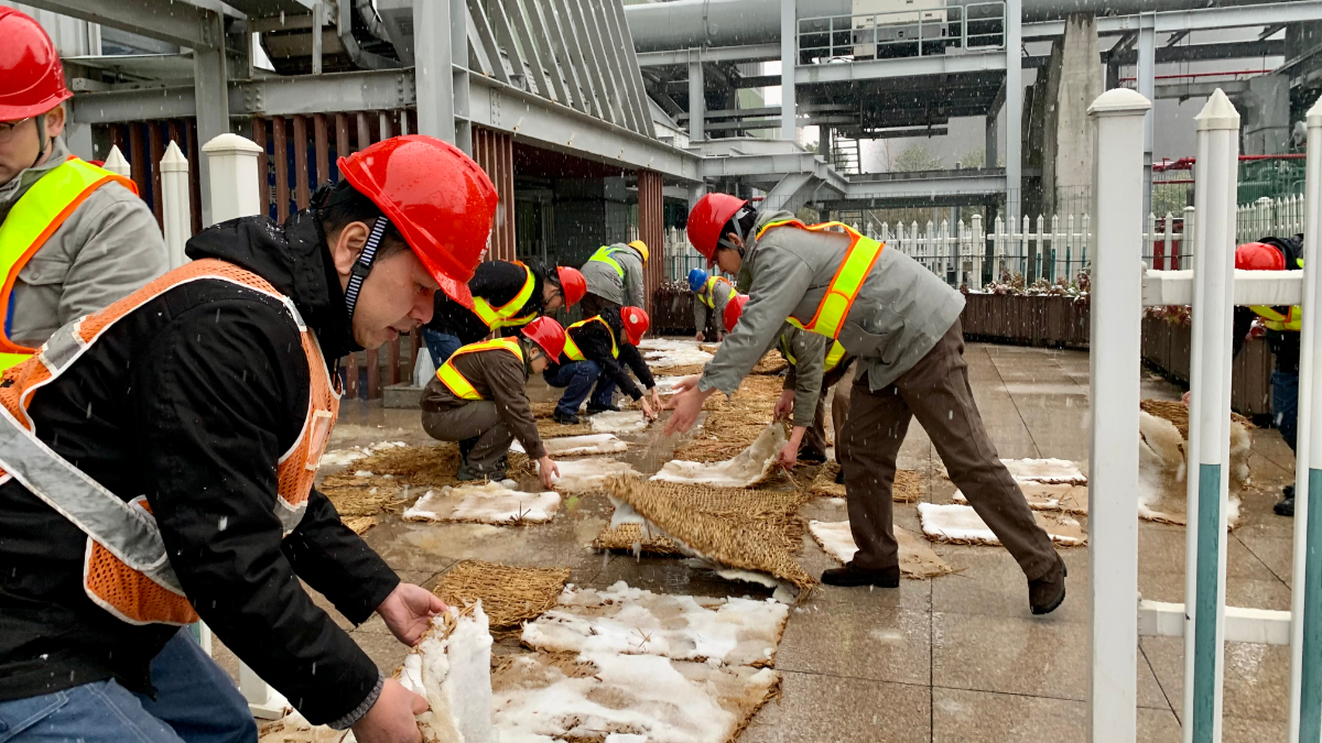 12月18日下午,浙能長興發(fā)電公司燃機(jī)項(xiàng)目部黨員志愿者冒著風(fēng)雪在廠區(qū)主干道鋪設(shè)防滑草墊,保障生產(chǎn)安全。 位亞飛 攝