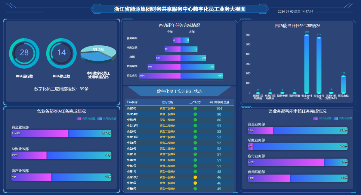 浙能財務共享運營平臺上線以來已推廣21批線上運行427家單位,開發(fā)129支標準化流程,與SAP等20個業(yè)財系統(tǒng)實現(xiàn)集成,覆蓋用戶3萬余人,從無到有打造以智能化、流程和數(shù)據(jù)驅(qū)動、業(yè)財稅資檔一體貫通、財務風險控制和財務人才培養(yǎng)為主,富有浙能特色、不斷迭代升級、賦能價值創(chuàng)造的財務共享金名片,走在浙江國資國企前列。在數(shù)智化方面,該平臺采用統(tǒng)一架構(gòu)的端到端數(shù)字化平臺,利用IPA智能流程自動化、OCR智能審核、AI、NLP自然語言處理、全場景遠程辦公等先進技術(shù)手段,搭建起流程、審核、運營和數(shù)治四個方面組成的智能應用體系,實現(xiàn)憑證和支付自動化率雙雙超過99%,其中數(shù)字員工、數(shù)字化監(jiān)督看板、智能語音提單、智能派單、智能客服等一批功能應用頗具特色、業(yè)內(nèi)領(lǐng)先,榮獲上國會“2022年智能財務最佳實踐年度綜合大獎”。