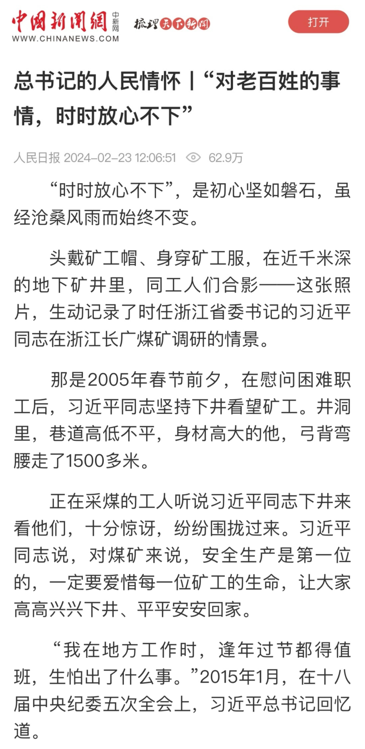 2月23日,中新網(wǎng)轉(zhuǎn)載《人民日報》頭版頭條文章《總書記的人民情懷》。 中新網(wǎng) 提供