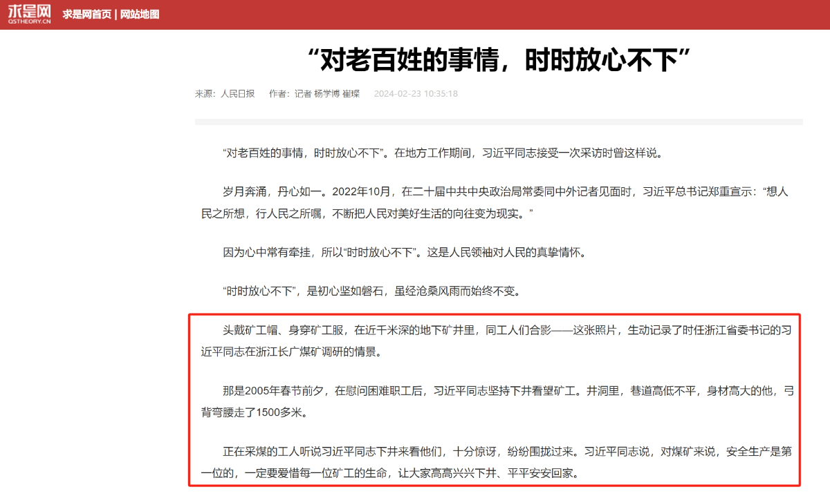 2月23日,求是網(wǎng)轉(zhuǎn)載《人民日報》頭版頭條文章《總書記的人民情懷》。 求是網(wǎng) 提供