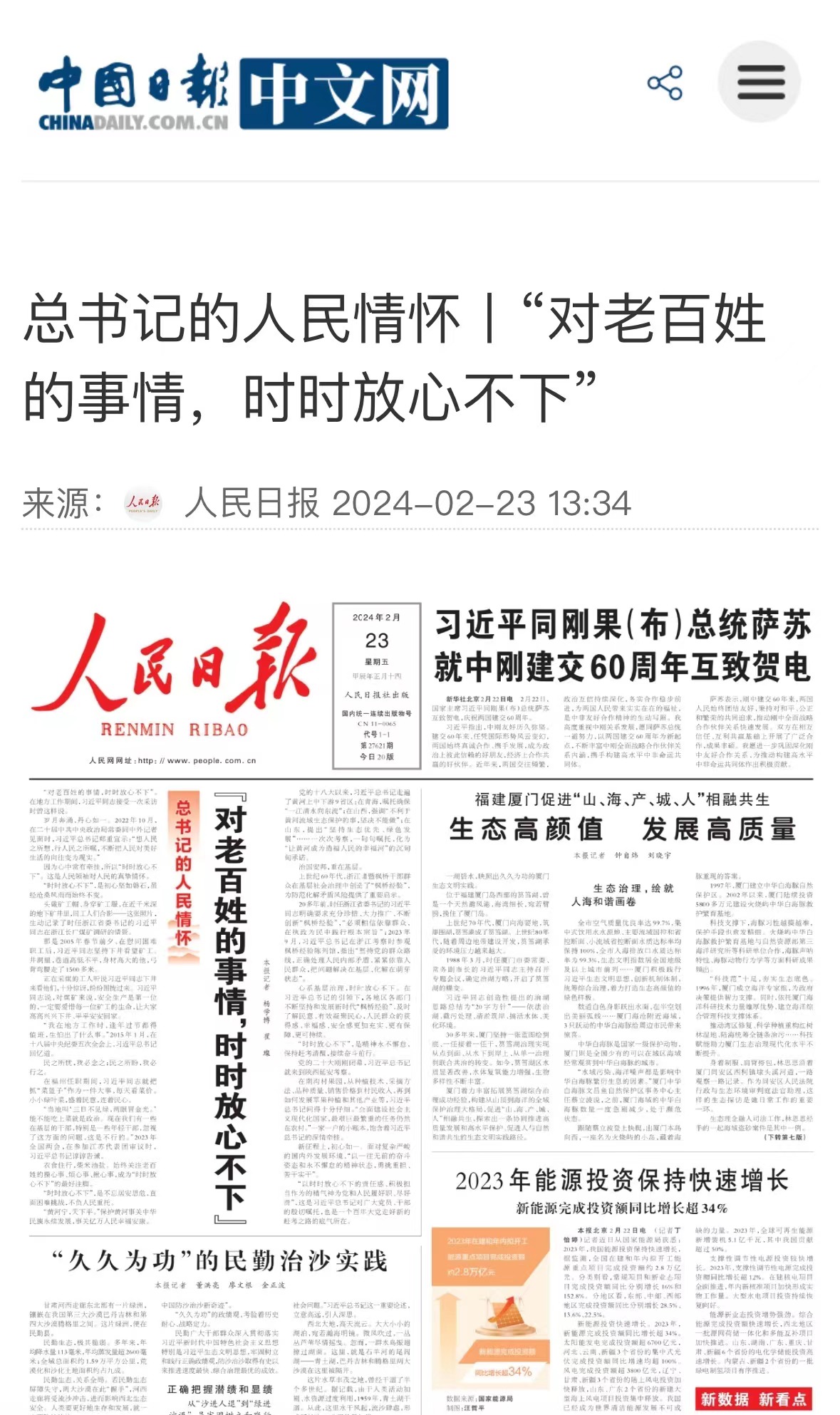 2月23日,中國日報轉(zhuǎn)載《人民日報》頭版頭條文章《總書記的人民情懷》。 中國日報 提供