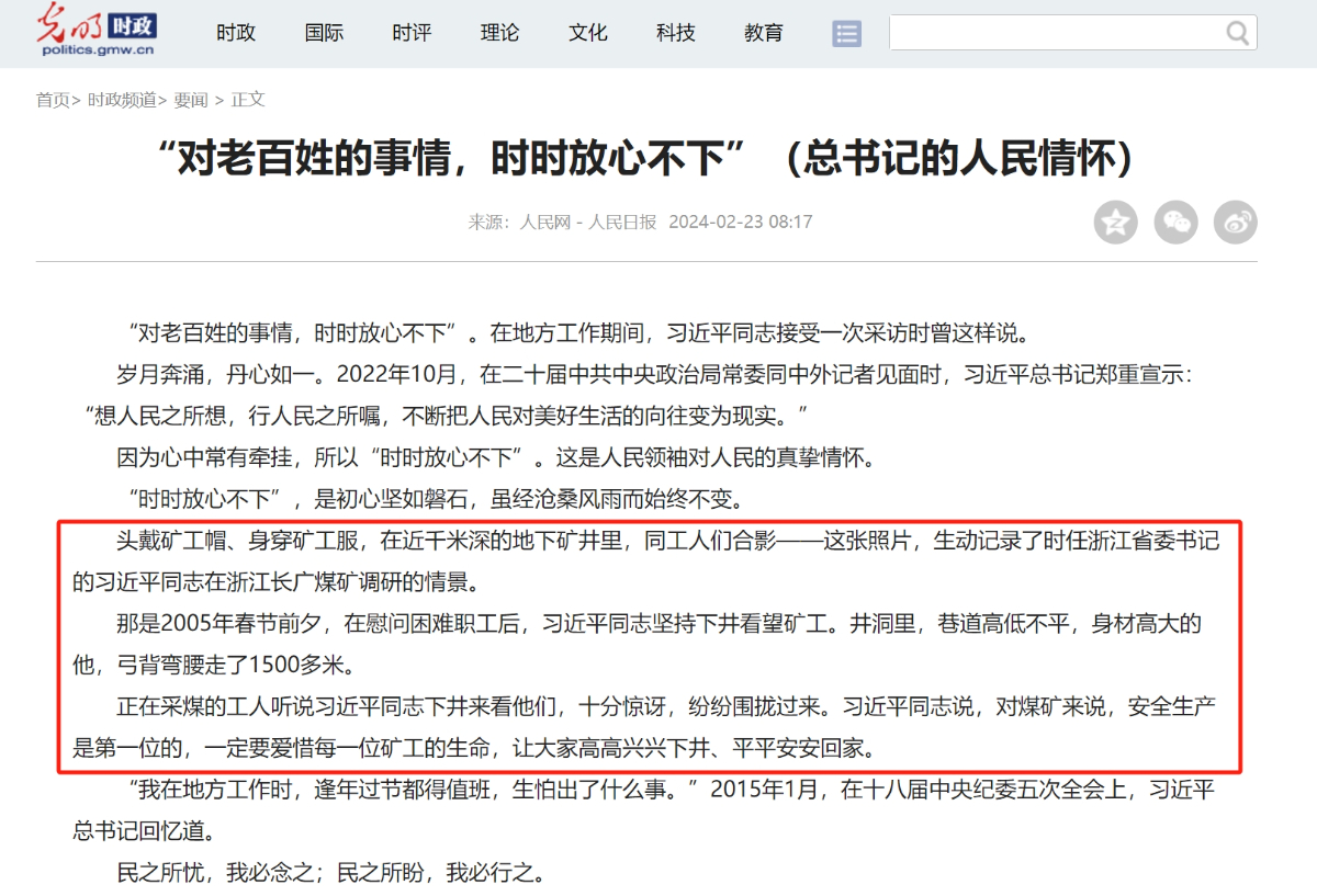 2月23日,光明網(wǎng)轉(zhuǎn)載《人民日報》頭版頭條文章《總書記的人民情懷》。 光明網(wǎng) 提供