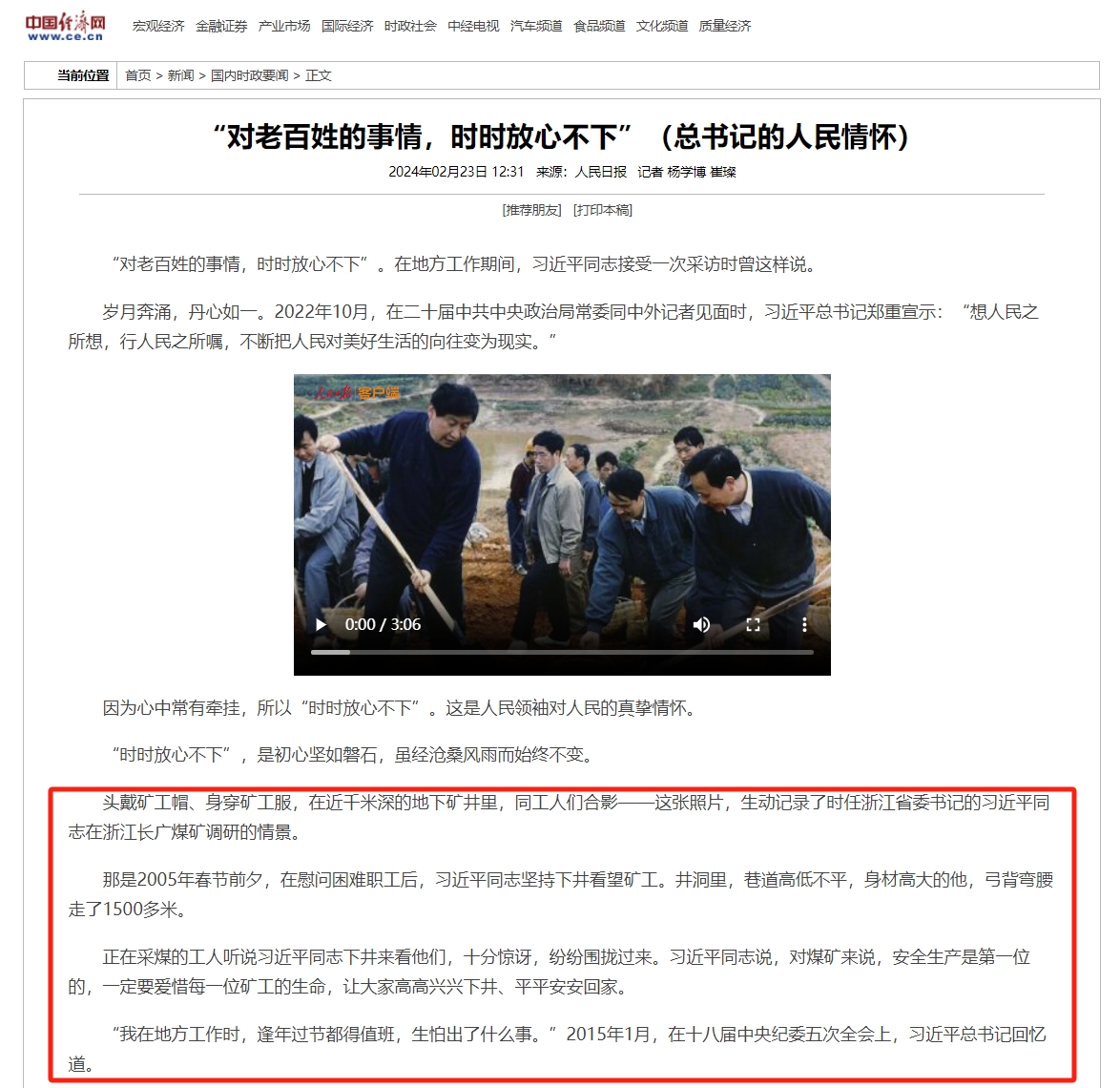本網(wǎng)訊 2月23日,《人民日報》頭版頭條刊登《總書記的人民情懷|“對老百姓的事情,時時放心不下”》,光明網(wǎng)、求是網(wǎng)、中國新聞網(wǎng)、中國日報中文網(wǎng)、中國經(jīng)濟(jì)網(wǎng)等多家央媒頭版轉(zhuǎn)載。“以時時放心不下的責(zé)任感、積極擔(dān)當(dāng)作為的精氣神為黨和人民履好職、盡好責(zé)”,這是習(xí)近平總書記對廣大黨員、干部的殷切囑托,也是一個百年大黨走好新的趕考之路的底氣所在。 文中記錄了習(xí)近平總書記的調(diào)研故事,其中第一個講述的就是時任浙江省委書記習(xí)近平同志到長廣煤礦調(diào)研的故事。
