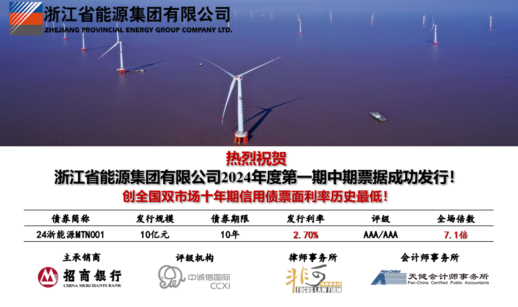 3月6日,浙能集團(tuán)成功公開發(fā)行10億元十年期中期票據(jù),票面利率2.70%。這是浙能集團(tuán)2024年在銀行間市場(chǎng)發(fā)行的首單十年期債券產(chǎn)品,創(chuàng)全國銀行間和交易所雙市場(chǎng)十年期信用債發(fā)行利率歷史最低。