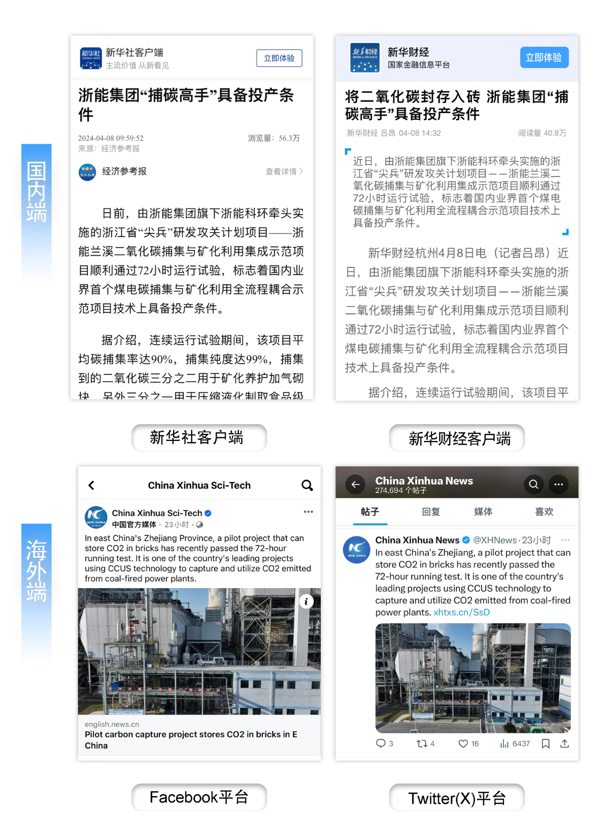 4月8日-4月9日,新華社客戶端、新華財(cái)經(jīng)客戶端及新華社facebook、Twitter(X)等社交媒體官方賬號報(bào)道《浙能集團(tuán)“捕碳高手”具備投產(chǎn)條件》。 新華社 圖