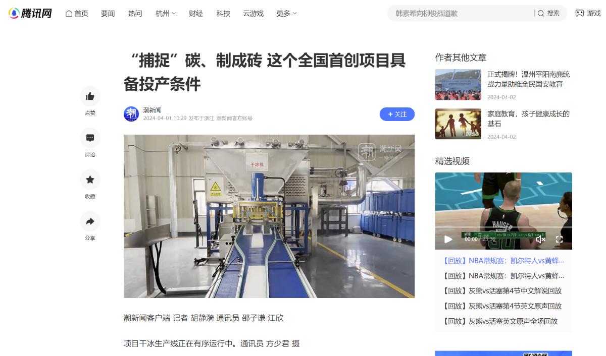 4月1日,騰訊網(wǎng)轉(zhuǎn)載報(bào)道《“捕捉”碳、制成磚 這個全國首創(chuàng)項(xiàng)目具備投產(chǎn)條件》。 騰訊網(wǎng) 圖
