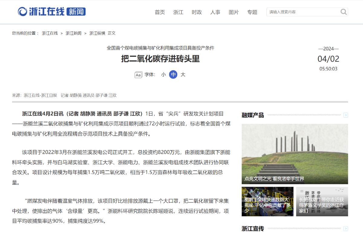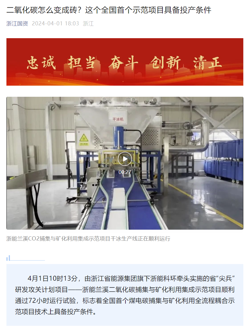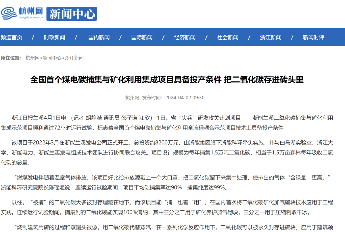 4月2日,浙江在線報(bào)道《全國首個煤電碳捕集與礦化利用集成項(xiàng)目具備投產(chǎn)條件 把二氧化碳存進(jìn)磚頭里》。 浙江在線 圖