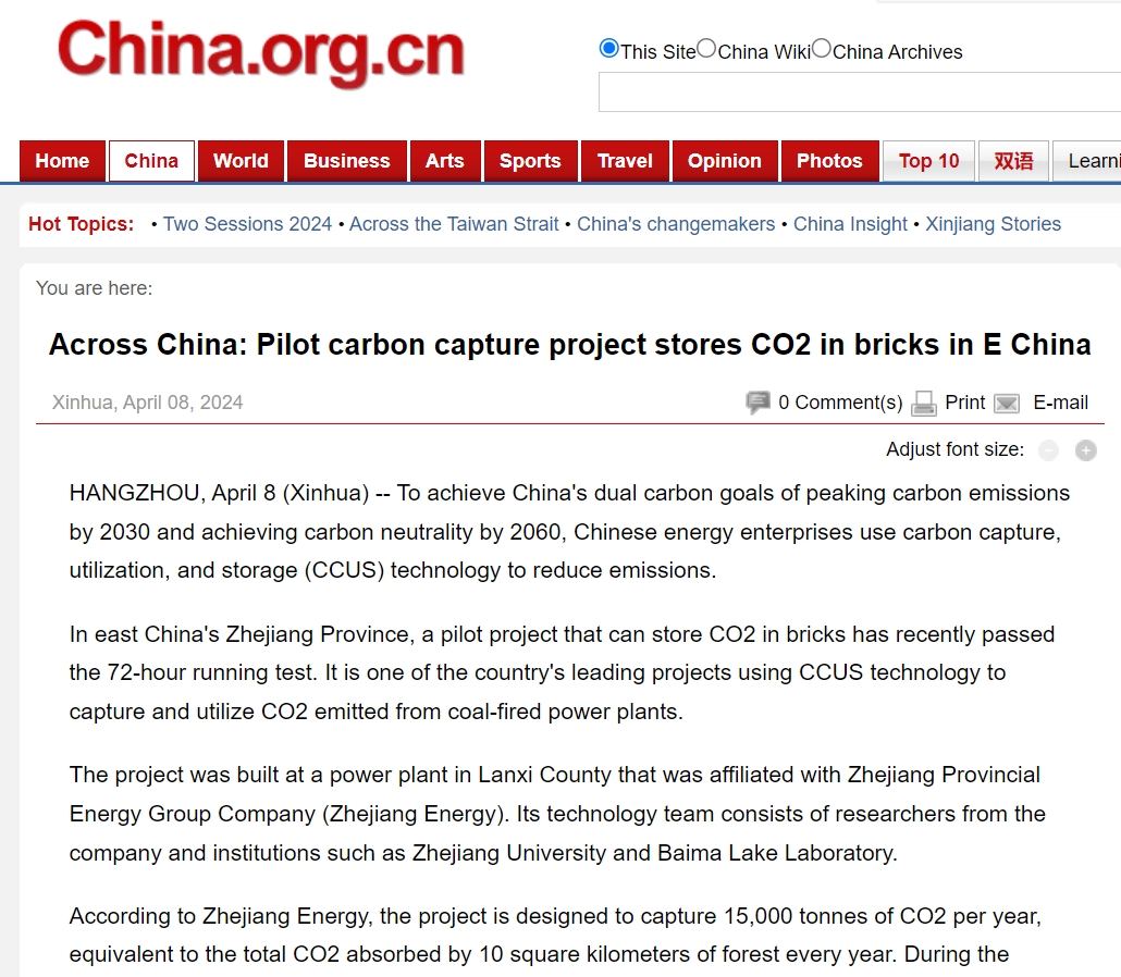 4月8日,中國網(wǎng)英文版報(bào)道《Across China: Pilot carbon capture project stores CO2 in bricks in E China》。 中國網(wǎng) 圖