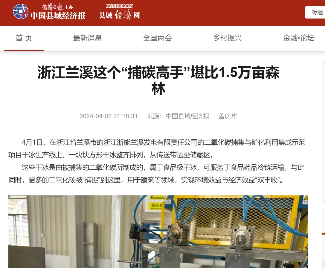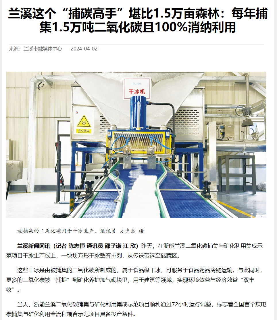 4月1日,蘭溪新聞網(wǎng)報(bào)道《蘭溪這個“捕碳高手”堪比1.5萬畝森林:每年捕集1.5萬噸二氧化碳且100%消納利用》。 蘭溪新聞網(wǎng) 圖