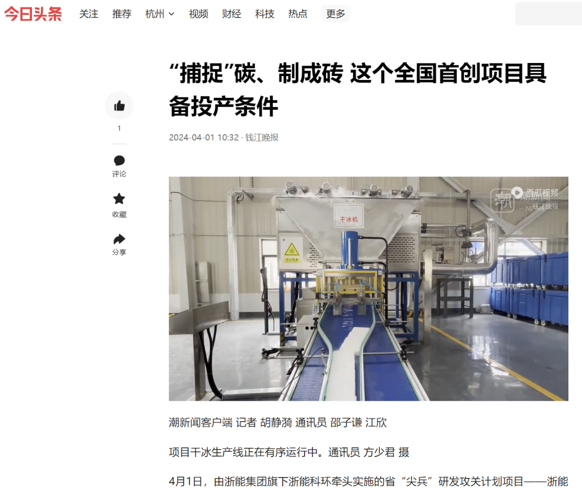 4月1日,今日頭條轉(zhuǎn)載報(bào)道《“捕捉”碳、制成磚 這個全國首創(chuàng)項(xiàng)目具備投產(chǎn)條件》。 今日頭條 圖