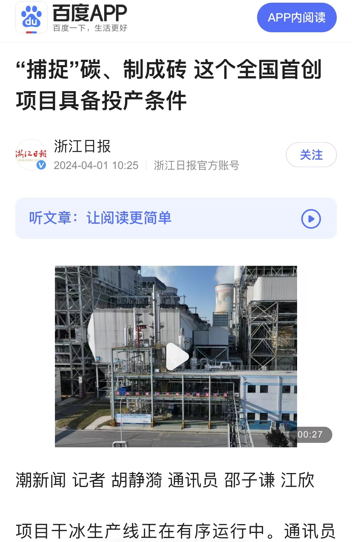 4月1日,浙江日報(bào)百度百家號轉(zhuǎn)載報(bào)道《“捕捉”碳、制成磚 這個全國首創(chuàng)項(xiàng)目具備投產(chǎn)條件》 百度百家號 圖