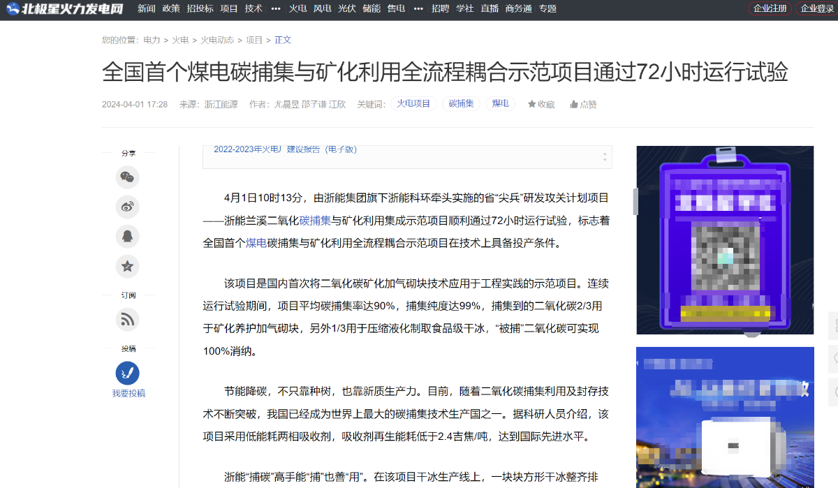 4月1日,北極星火力發(fā)電網(wǎng)轉(zhuǎn)載報(bào)道《全國首個煤電碳捕集與礦化利用全流程耦合示范項(xiàng)目通過72小時運(yùn)行試驗(yàn)》。 北極星火力發(fā)電網(wǎng) 圖