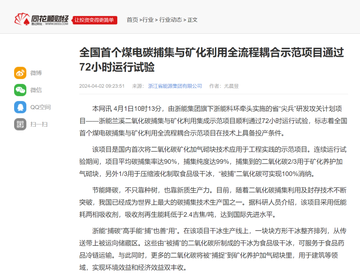 4月2日,同花順財(cái)經(jīng)報(bào)道《全國首個煤電碳捕集與礦化利用全流程耦合示范項(xiàng)目通過72小時運(yùn)行試驗(yàn)》。 同花順財(cái)經(jīng) 圖