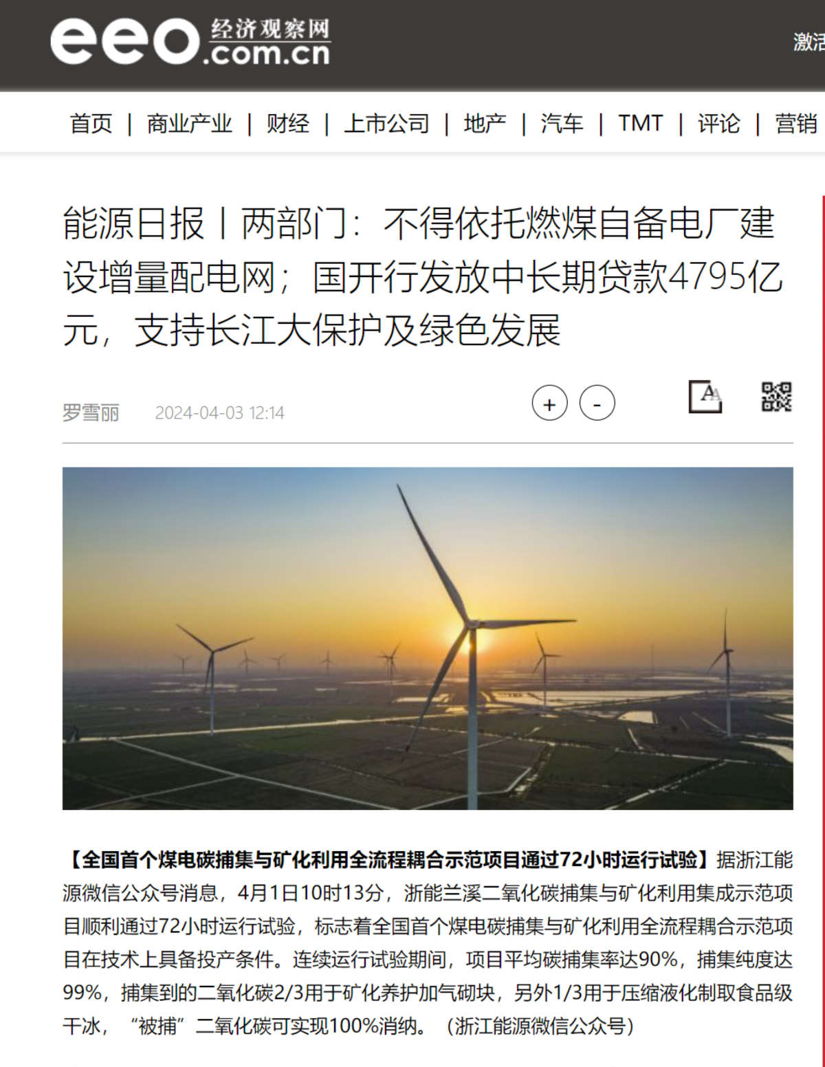 4月3日,經(jīng)濟(jì)觀察網(wǎng)能源日報(bào)專欄轉(zhuǎn)載報(bào)道《全國首個煤電碳捕集與礦化利用全流程耦合示范項(xiàng)目通過72小時運(yùn)行試驗(yàn)》。 經(jīng)濟(jì)觀察網(wǎng) 圖