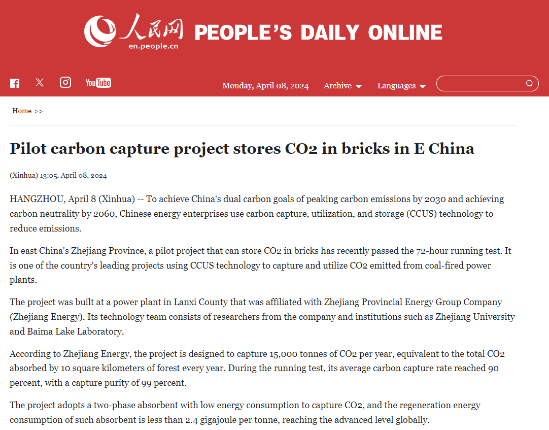 4月8日,人民日報(bào)旗下人民網(wǎng)英文版報(bào)道《Pilot carbon capture project stores CO2 in bricks in E China》。 人民網(wǎng)英文版 圖