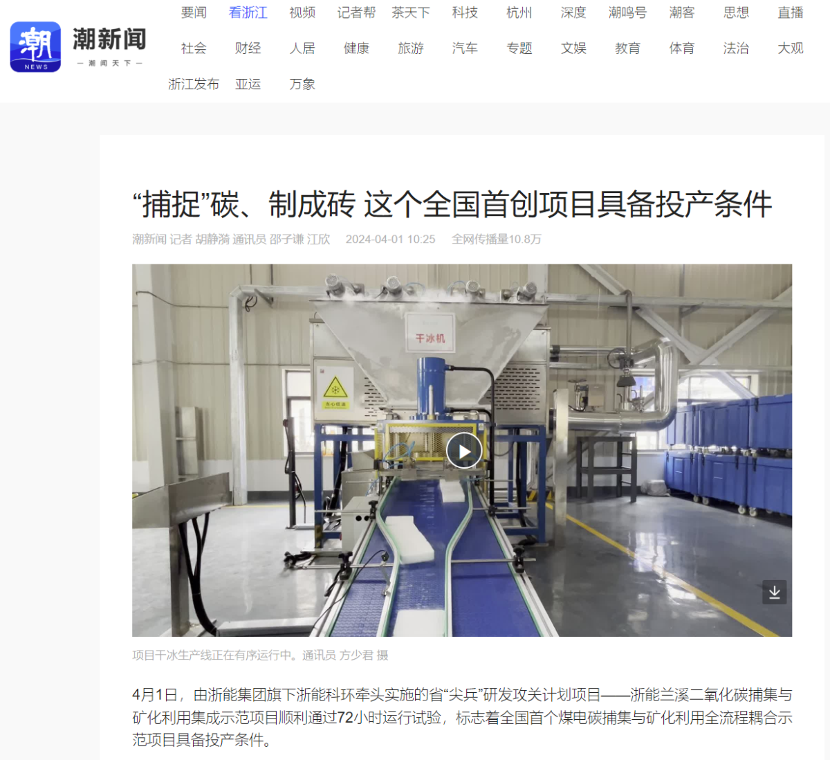4月1日,浙報(bào)集團(tuán)潮新聞客戶端報(bào)道《“捕捉”碳、制成磚 這個全國首創(chuàng)項(xiàng)目具備投產(chǎn)條件》。 潮新聞客戶端 圖